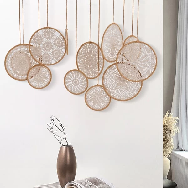 This bohemian hanging wall decoration is made of high-quality cotton linen, a set of 12 pieces, including 6 large circles and 6 small circles, each circle wall decoration is very unique, with a hollow in the middle The design adds artistic beauty, hang them in the living room, bedroom, entryway or any suitable space, it will be a good decoration.