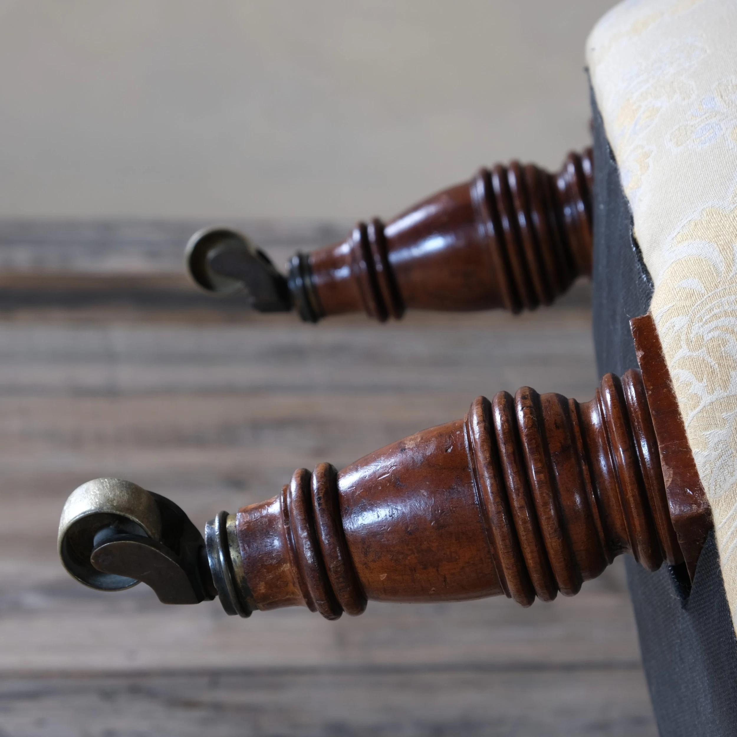 A 19th century iron backed nursing chair raised on walnut turned legs and the original brass casters.