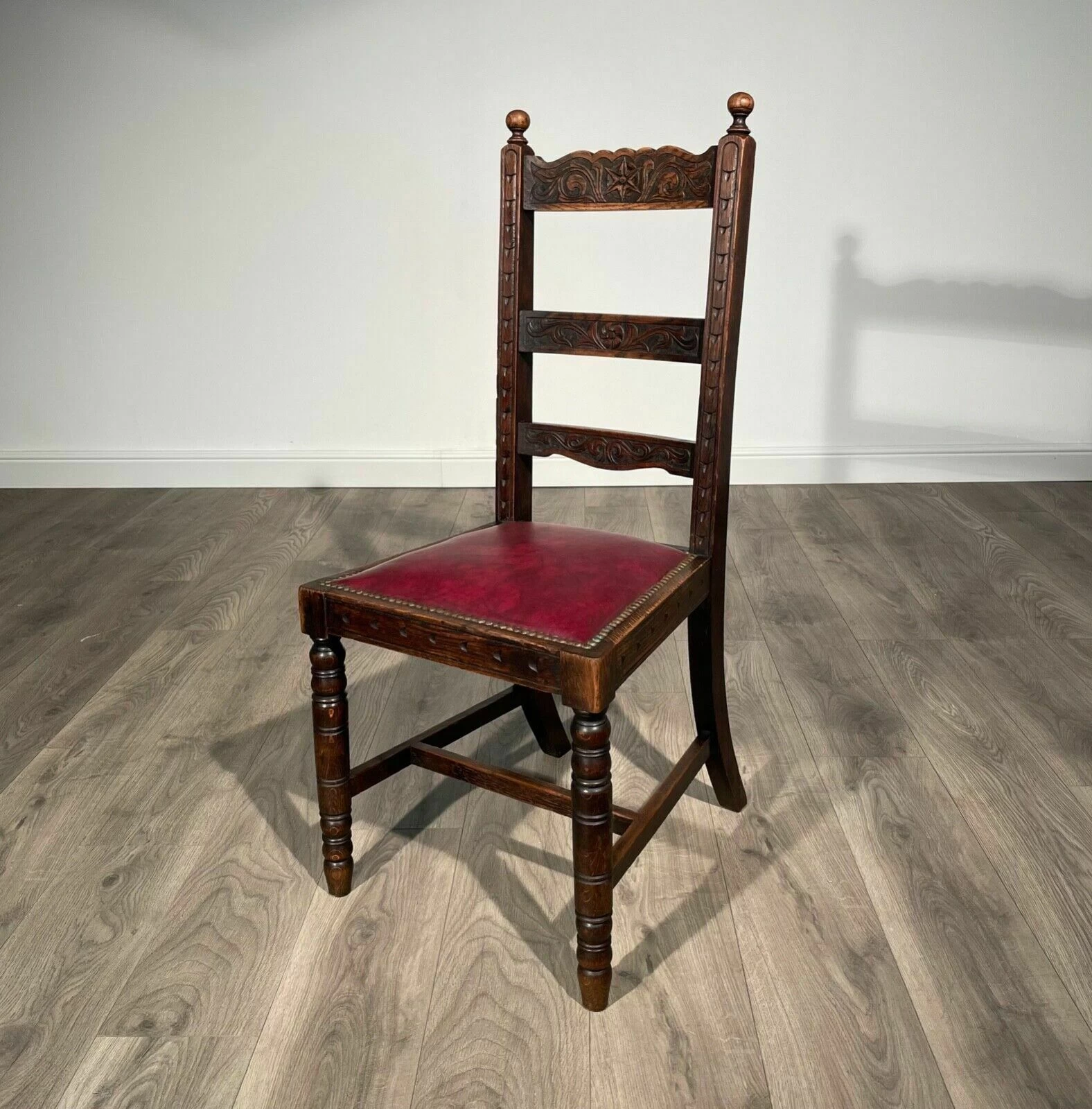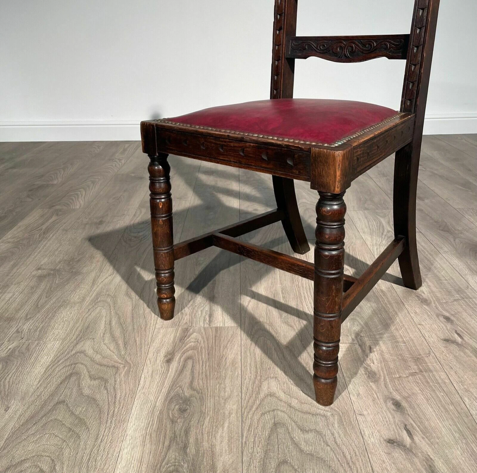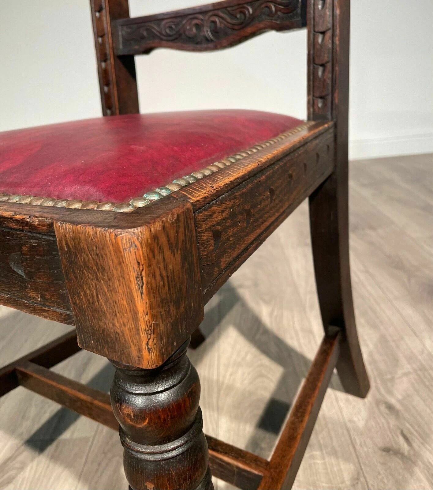 The chairs are stood on turned legs with a supporting cross stretcher and have drop in seats upholstered in red leather.