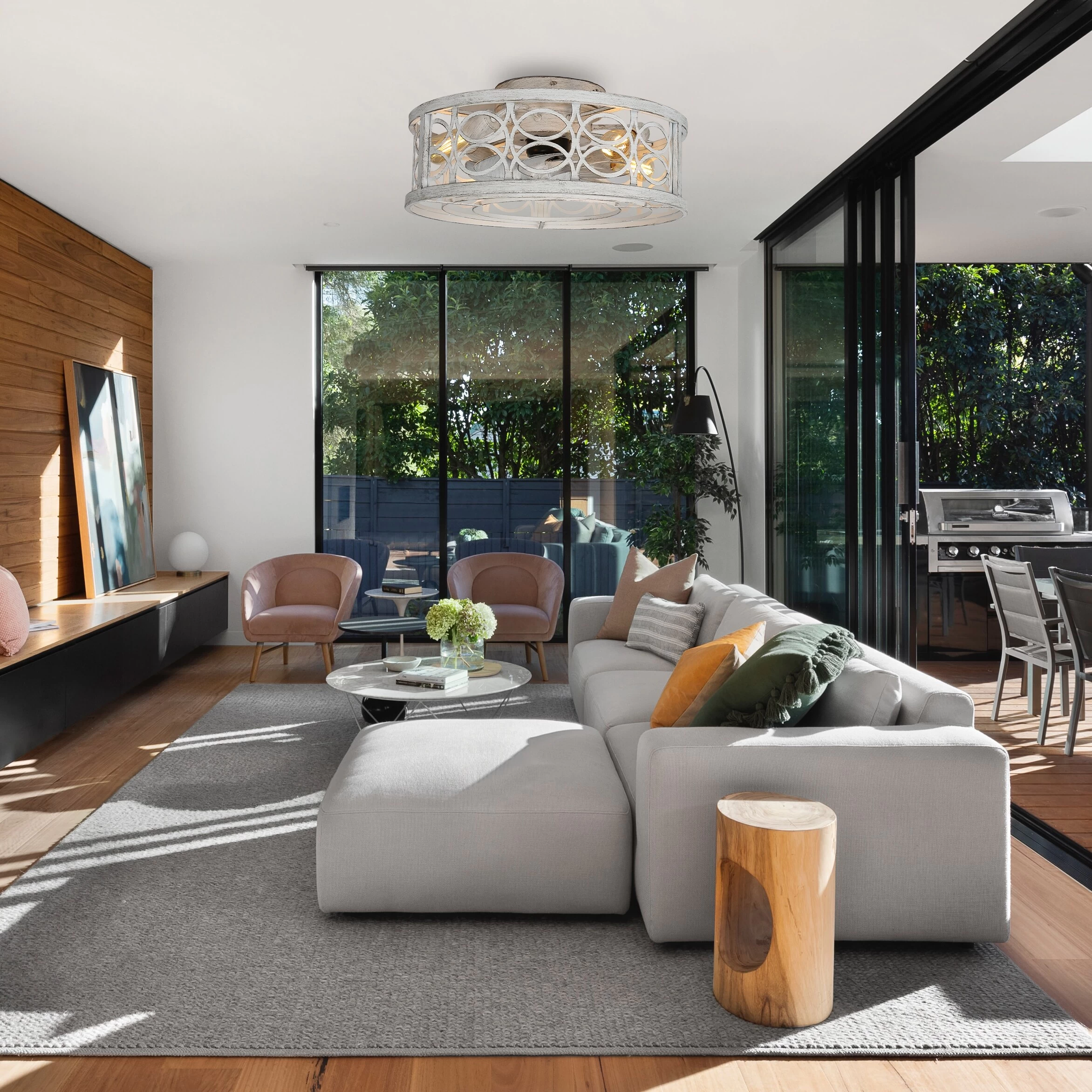 - With a modern drum-shaped metal structure and a elegant distressed cream finish, this fixture is perfect for contemporary and farmhouse décors.