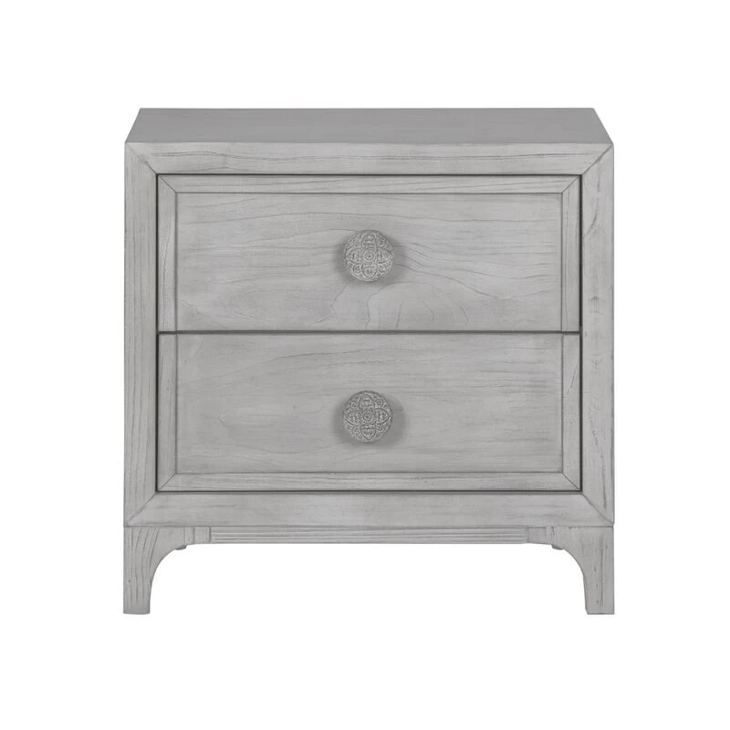 Add a dash of Bohemian flair to your bedroom with this exquisitely designed nightstand. Two spacious drawers provide ample space for bedside necessities. The carved mandala pattern knobs provide access to your belongings while the washed white finish highlights the grain details all over the frame. Check out our Lou Collection for more options.