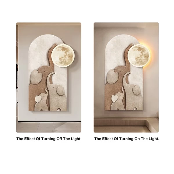 -This wall decoration is made of high-quality acrylic and MDF materials. The scene of three elephants looking up at the moon is very cute and warm.