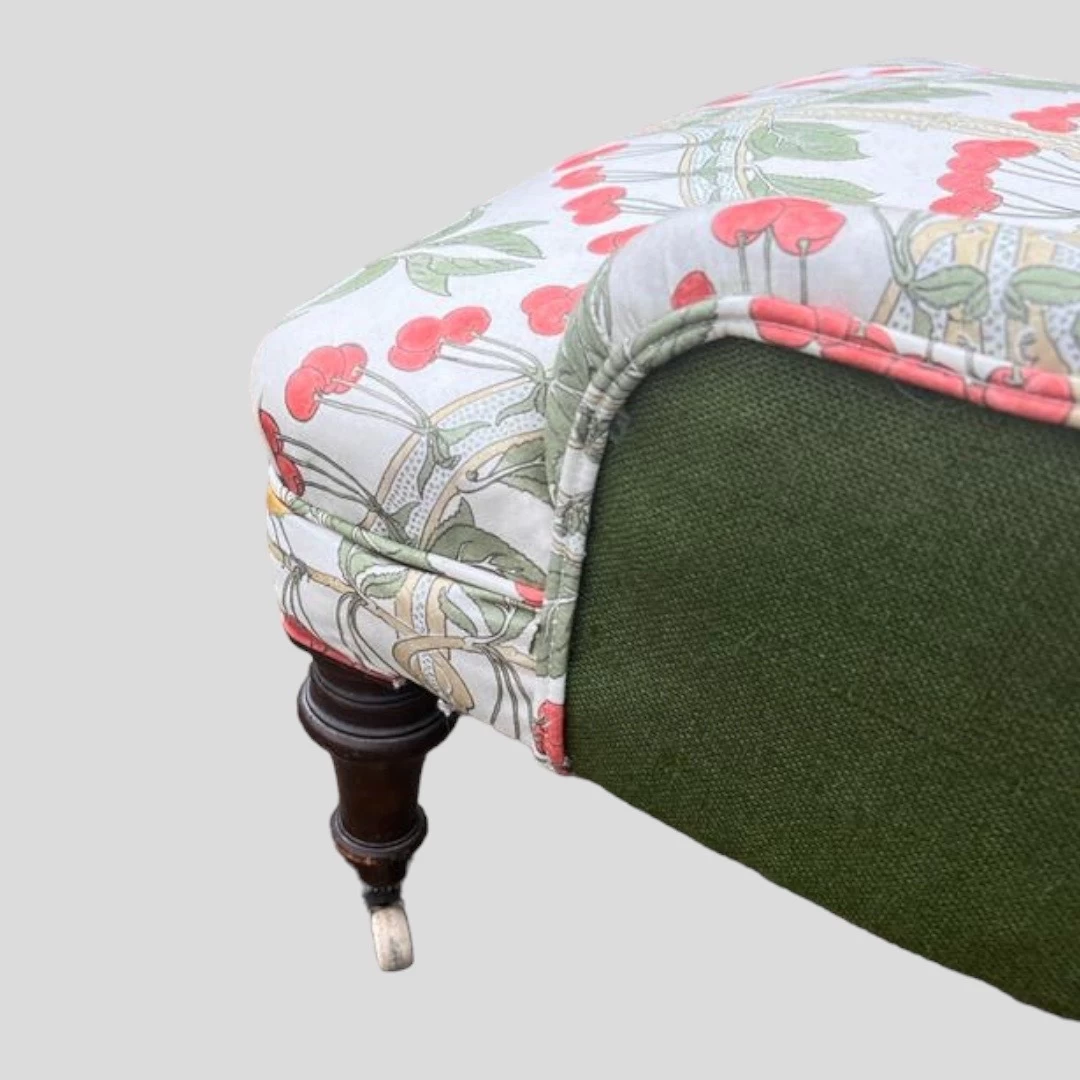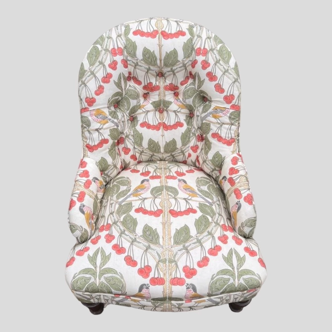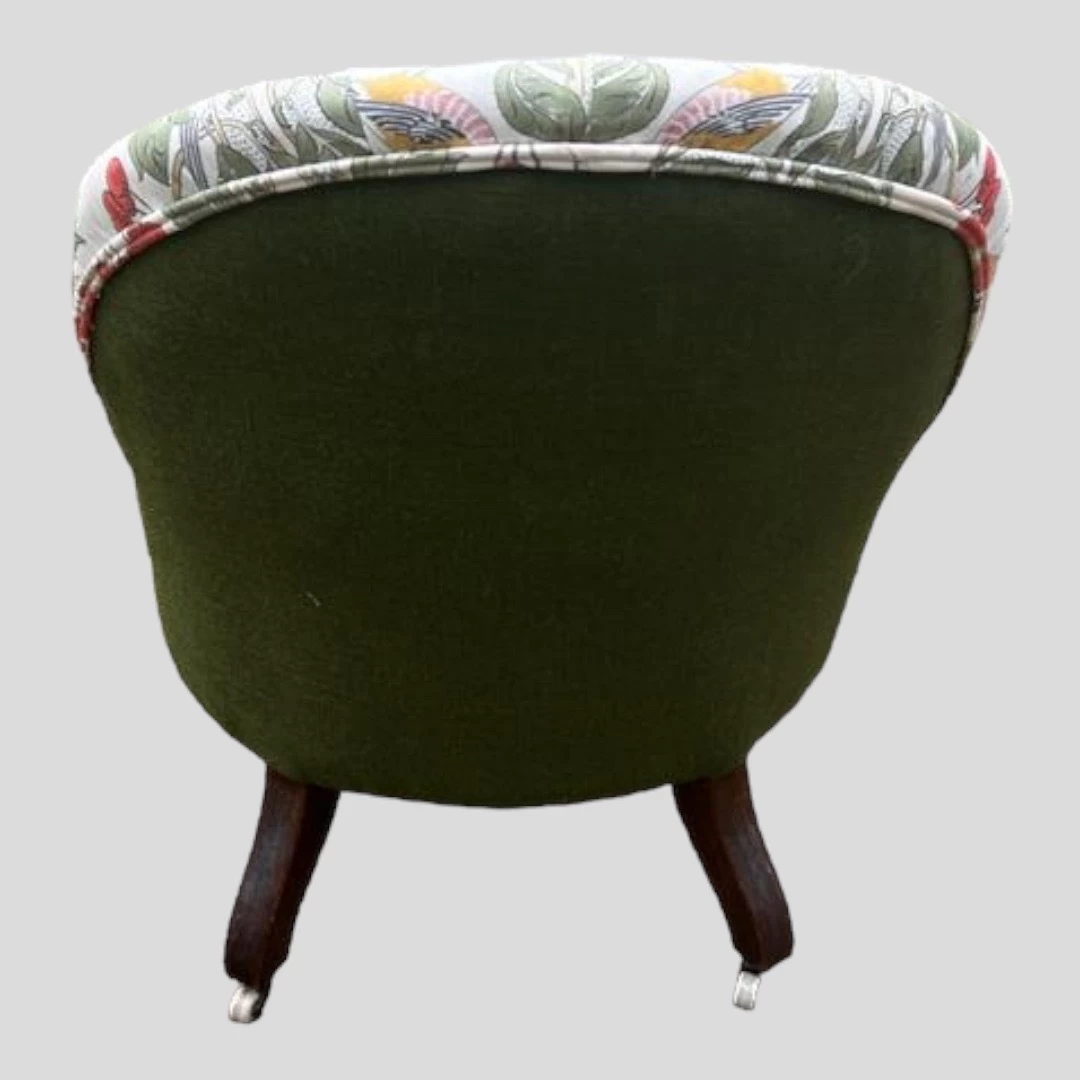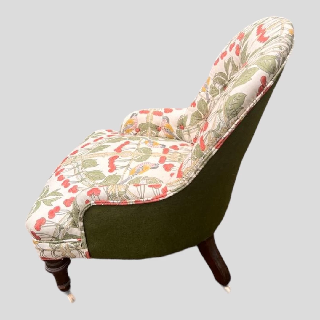 A Victorian Bedroom Chair upholstered in button backed mint colour with mahogany legs leading to castors recovered in GP &J Baker ‘Birds and Cherries’ (red/green).fabric