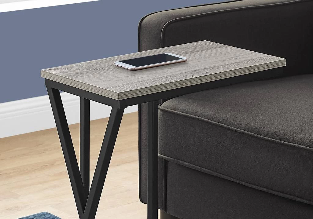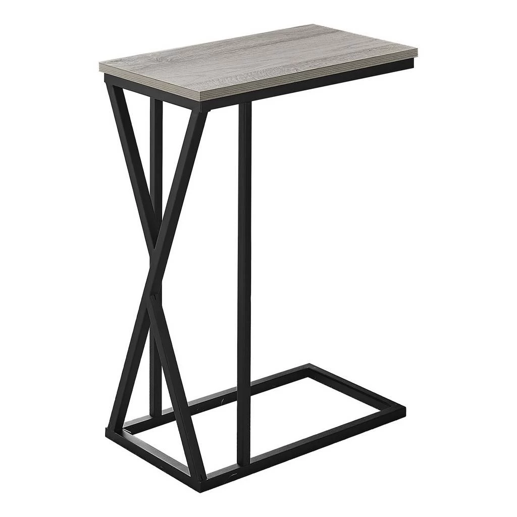Straight lines and clean angles give this C-shaped accent table an elegantly modern look. The rectangular tabletop in a smooth / grey wood-look finish is supported by the black metal frame with intersecting lines that form two asymmetrical triangles. Slide this versatile end table under a sofa or chair to place snacks or mobile devices or use as a side table next to a bed.
