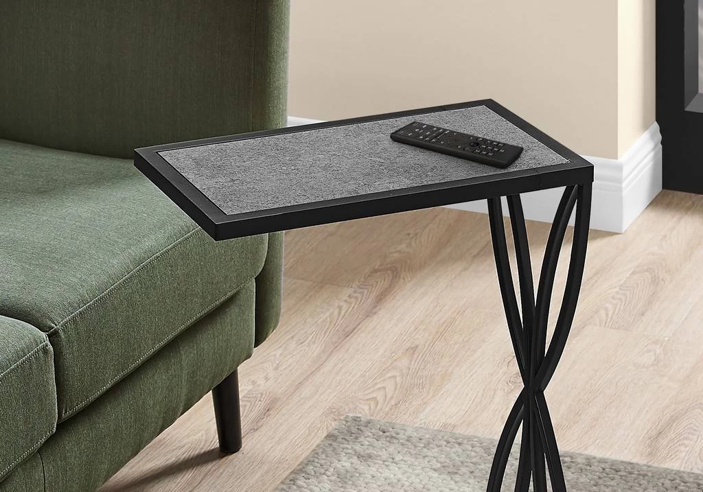 Straight lines join with sleek curves to give this C-shaped accent table a sophisticated look. The rectangular tabletop in a textured / grey stone-look finish is bordered by a black metal frame that extends down to the base. The geometric flower petal design of the frame adds a decorative touch. This versatile end table is ideal for living rooms or bedrooms as a convenient surface to place items like a small clock / remote / or mobile device.