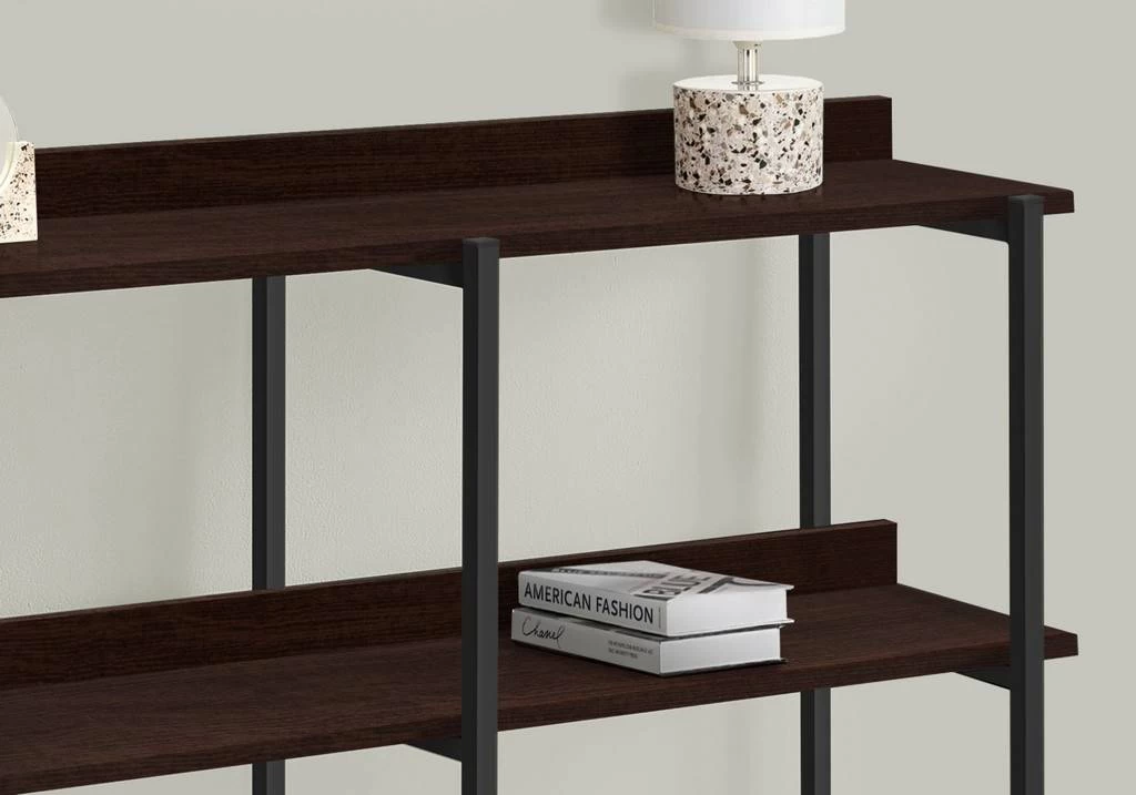 Proudly display prized possessions on this rectangular console table with 3-tier shelving. Underneath the long / narrow tabletop are shelves arranged on 2 levels. Distribute books / plants / and decorative items among the tabletop and shelves / which are in an elegant dark-brown espresso laminate finish. The sturdy metal frame in a contrasting black finish features clean lines and right angles for a modern look. With its narrow profile and generous display space / this versatile accent table with storage is ideal for a hallway / an entryway / or behind a sofa in a living room.