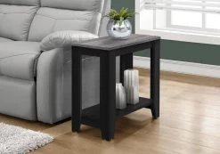 Enhance your living space with this grey wood grain look and black rectangular side table. Featuring ample surface area and a two tiered design / this accent table is perfect for displaying a lamp / picture frames or your favorite decorative items. The sturdy tapered legs and rich black finish on all sides will add warmth to any room in your home.