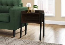Save space while providing the perfect sidekick to any furniture ensemble. This end table / featuring an espresso wood look finish / is equipped with an open shelf and modern black metal legs to complete the industrial-inspired design. Made for showing off your favorite items or storing books in the living room or family room / this side table can also be used as a bedside table. It is an on-trend piece that is waiting to be added to any living space. Assembly is required.