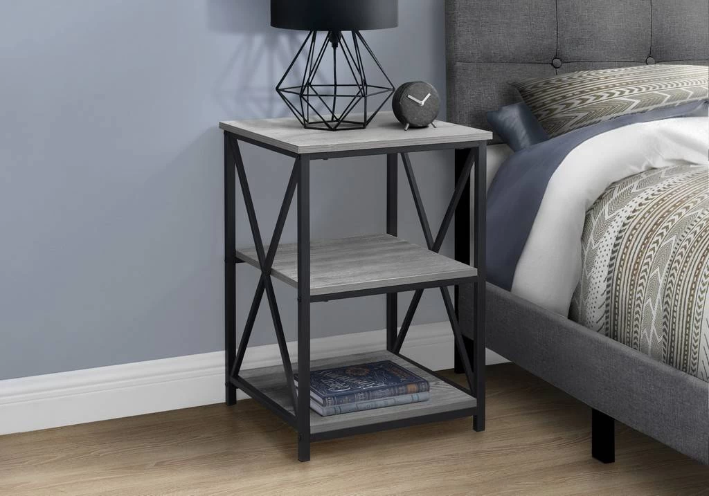 This simple / contemporary style end table with an industrial look is a multi-functional accent piece suitable for any room. The stylish black metal legs with an “X” design on the two sides / contrasts with the warmth of the grey wood look laminate square tops. The two open bottom shelves offer a convenient storage space for books / magazines / or decorative objects with room on top for a small lamp or a place to set down your drink. Bring it into the bedroom as a sleek and compact nightstand for a clean modern touch. Assembly is required.