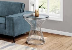 If you want a unique accent piece to complement your living room or bedroom / then look no further than this elegant round side table with an open hourglass base. The spacious tempered glass top is large enough to place a lamp / decorative item / or a drink / while the subtle finish on the sturdy wired stainless-steel base blends with many styles. The size of this end table is perfect / even for small spaces with its contemporary boho appeal / and it is versatile enough to bring it into the bedroom as a stylish nightstand. Assembly is required.