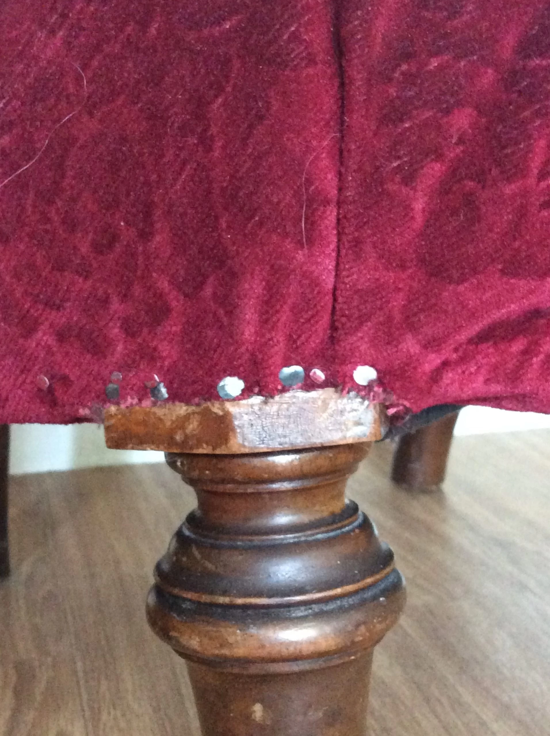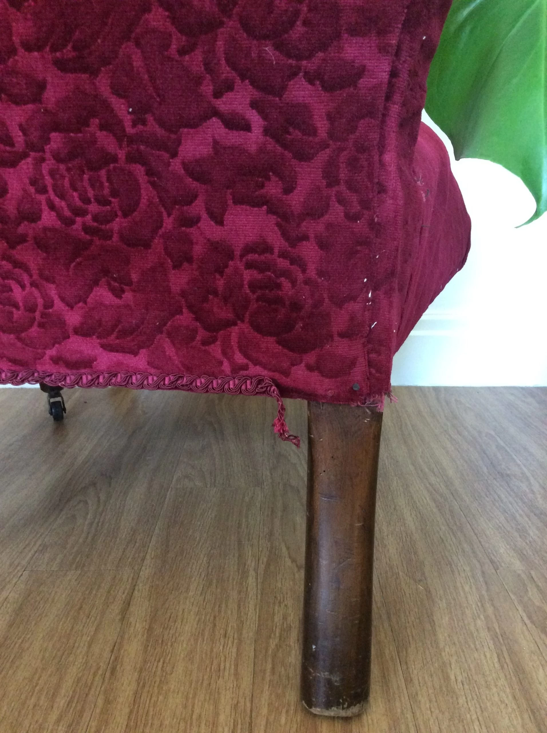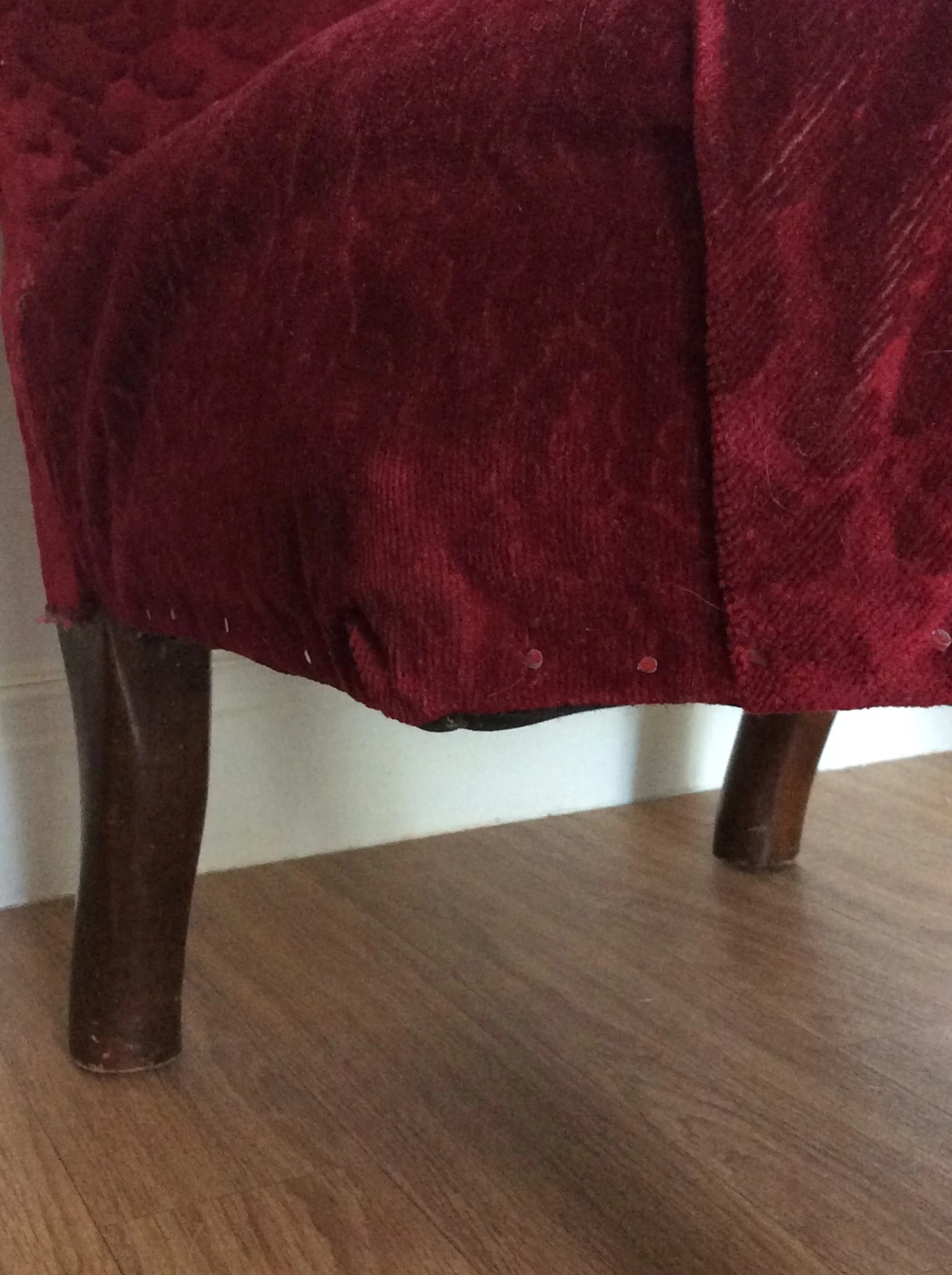 Material is red velvet jacquard which has been tacked on with pins. Springs and seat filling need to be re bolstered.