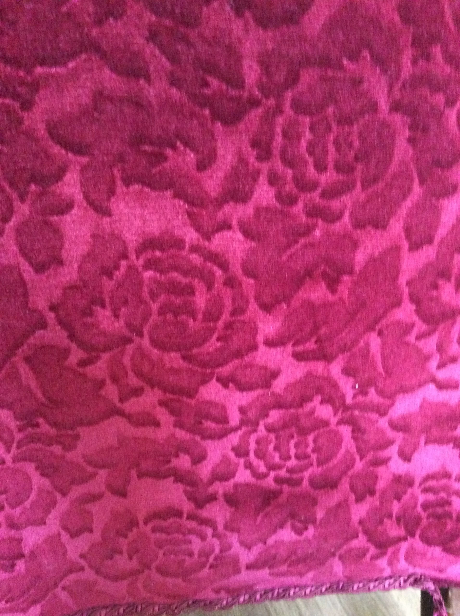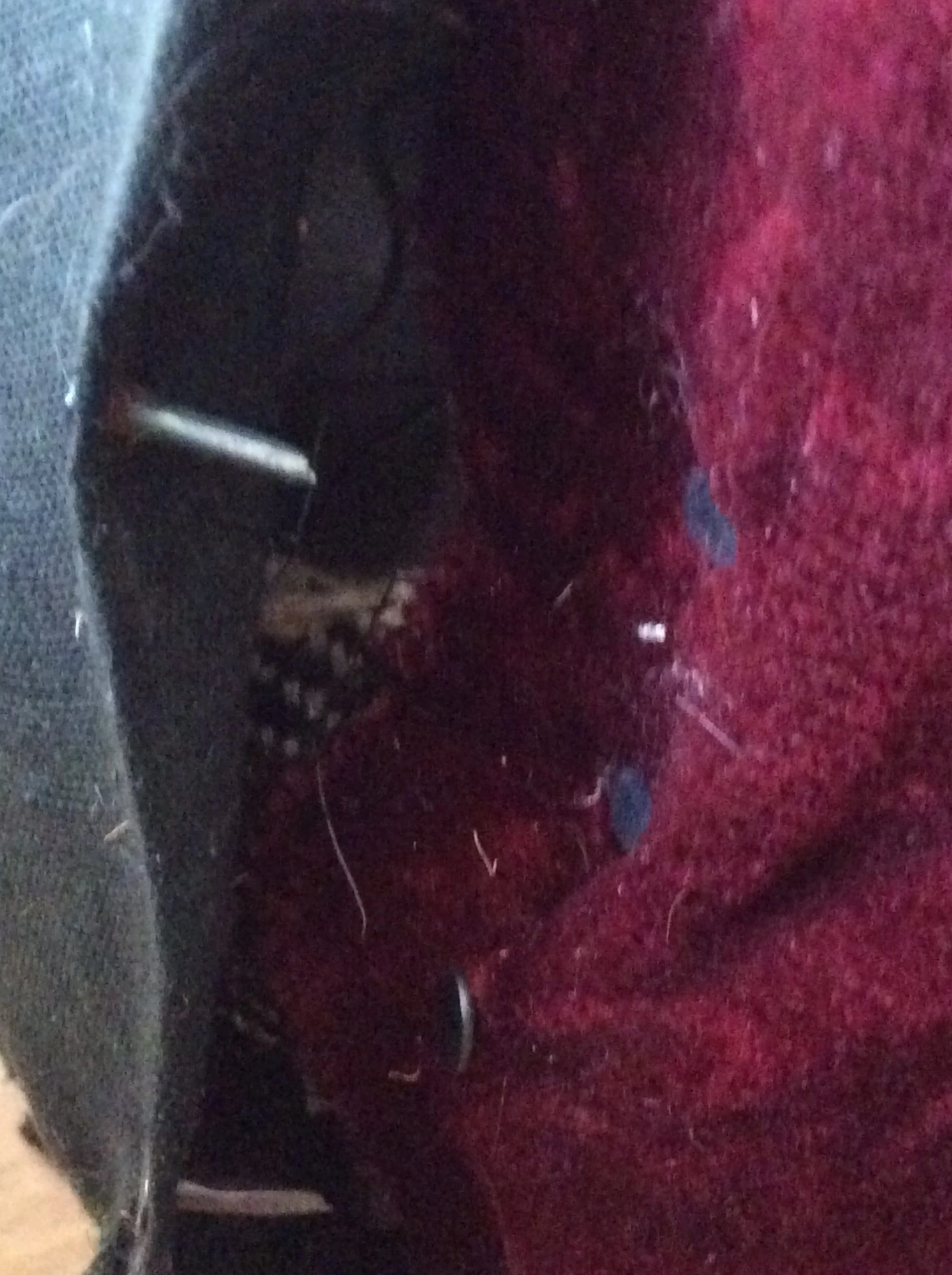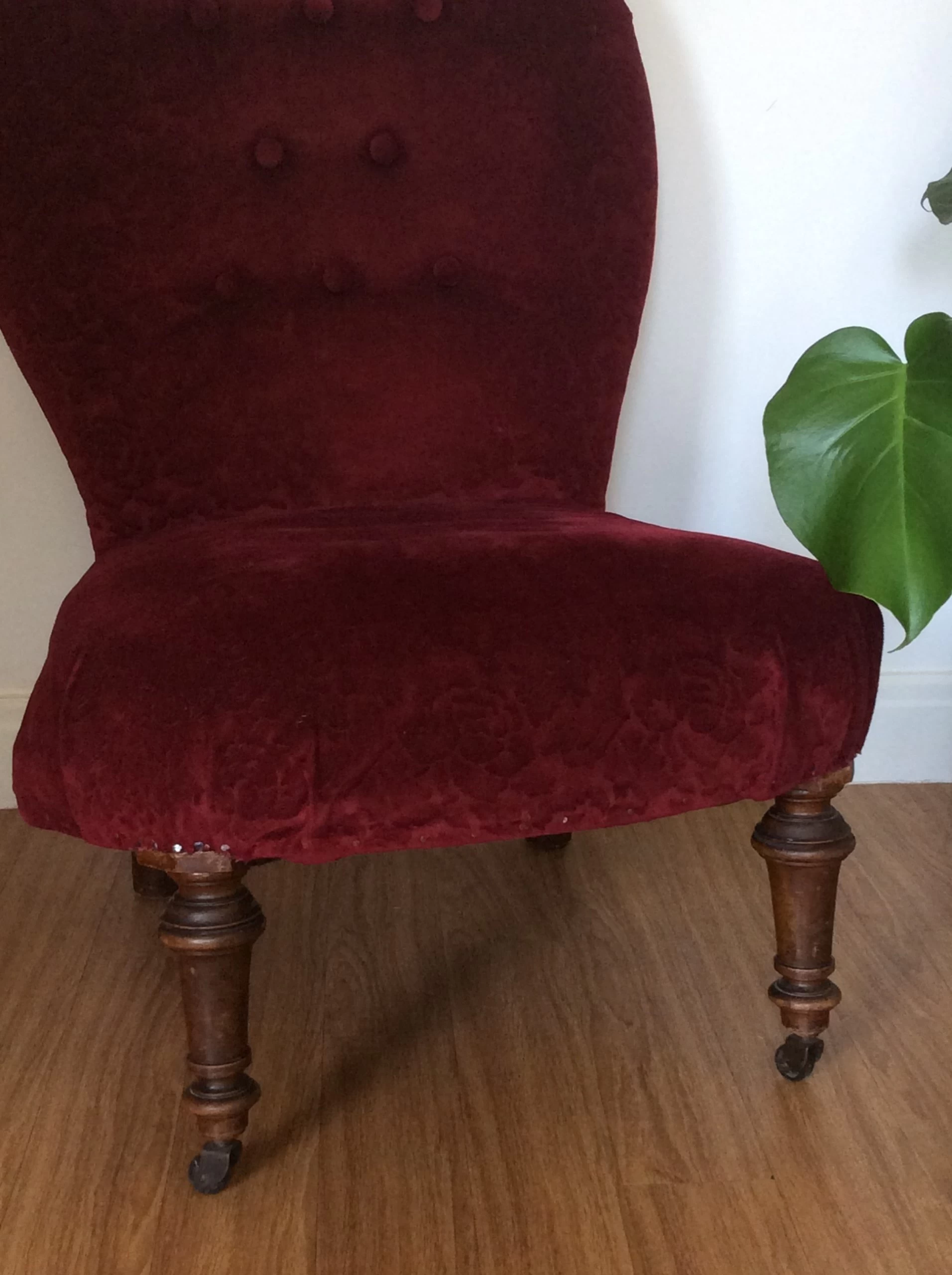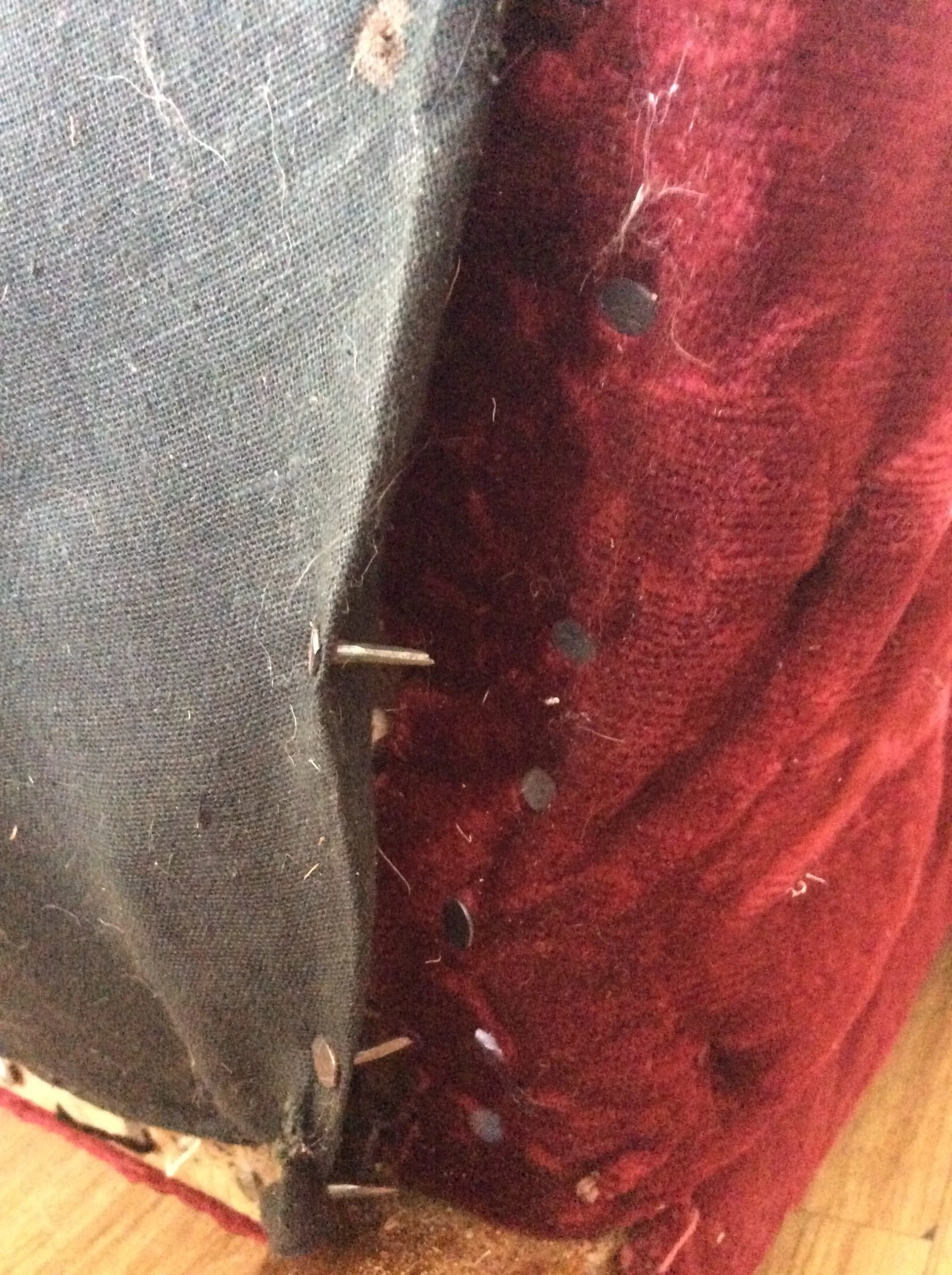 Material is red velvet jacquard which has been tacked on with pins. Springs and seat filling need to be re bolstered.