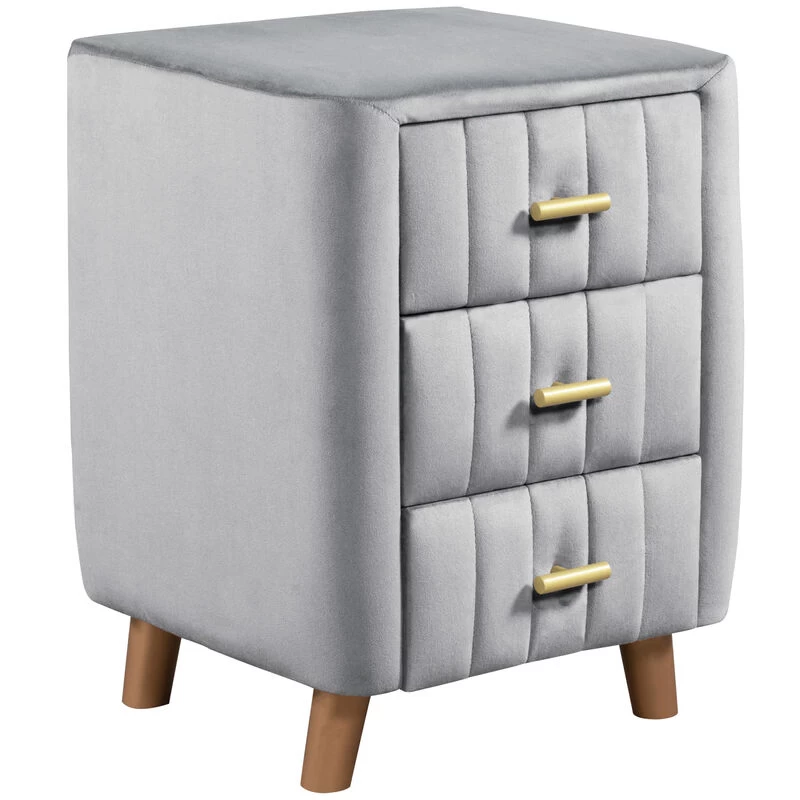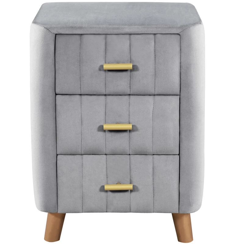 This contemporary and distinguished drawer nightstand made of solid pine wood and velvet upholstery features three drawers for maximum storage, a sturdy tabletop for personal items, and stable legs with floor protection.