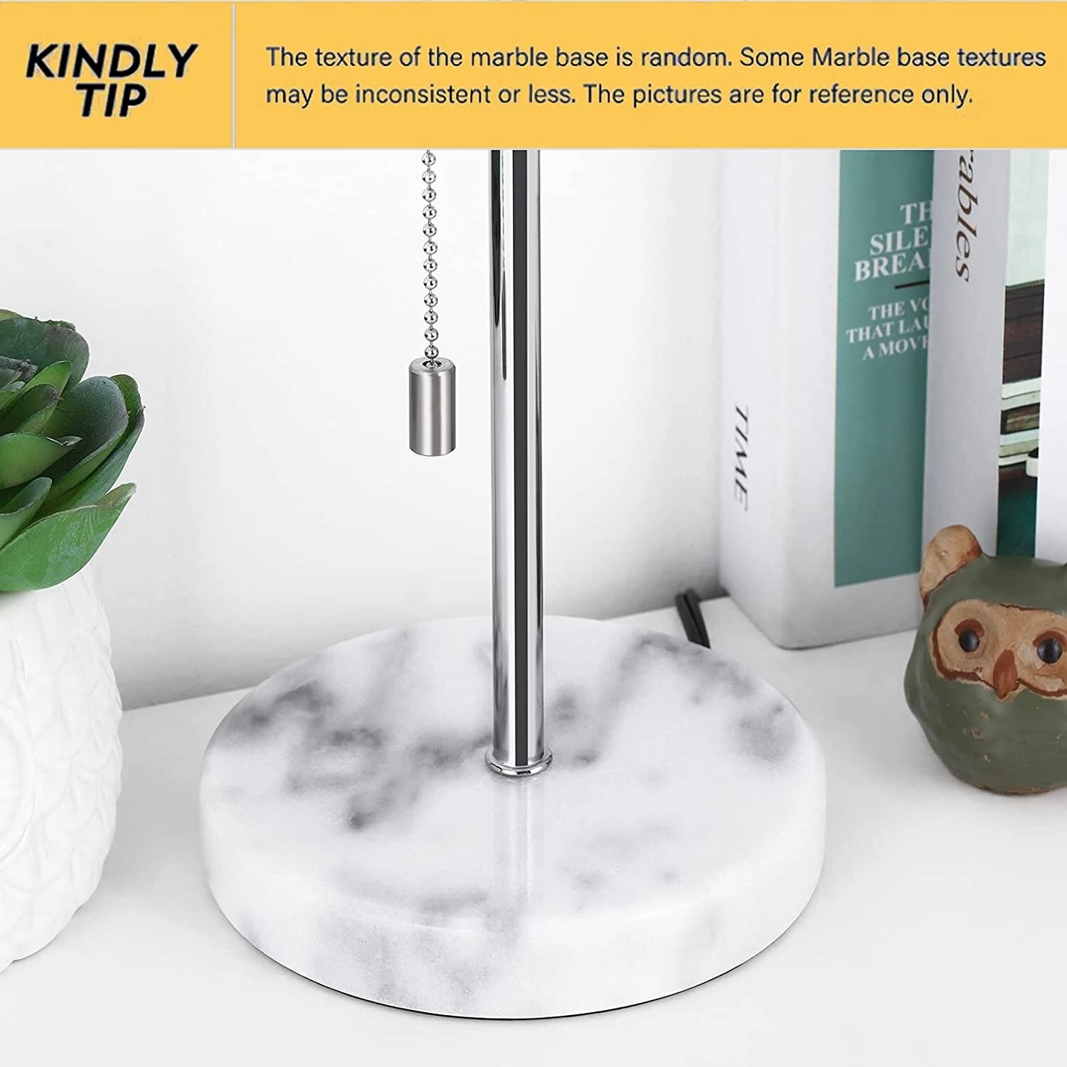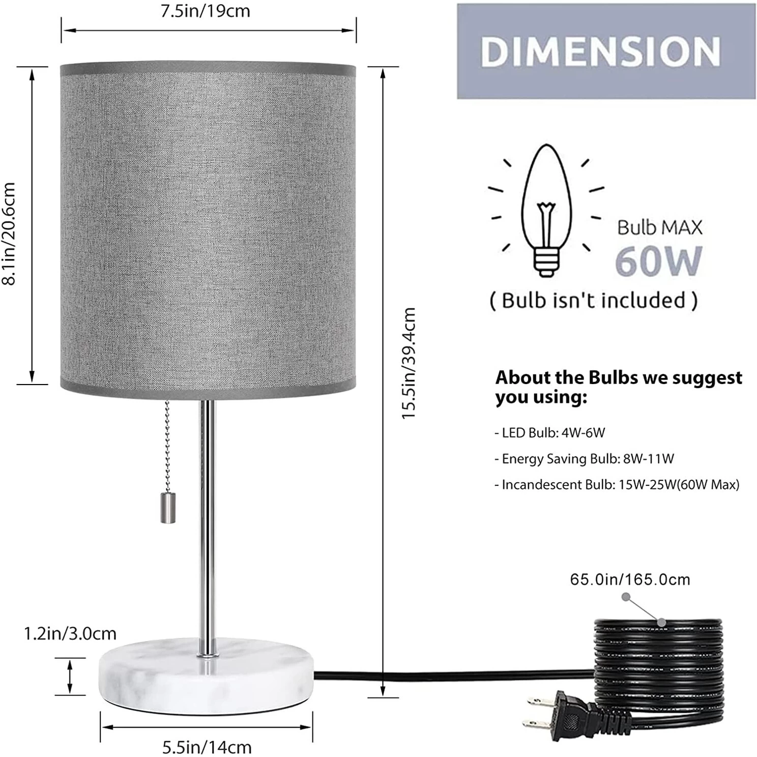 - 【SAFETY & HIGH-QUALITY】 Its ON/OFF pull chain switch is easier to turn the light on or off without having to get up and flip a switch. The cord and plug of small lamp are UL listed, safe to use. The nightstand lamp is integrated with high quality fabric shade, weighted marble base, which is enduring, durable and aesthetic.