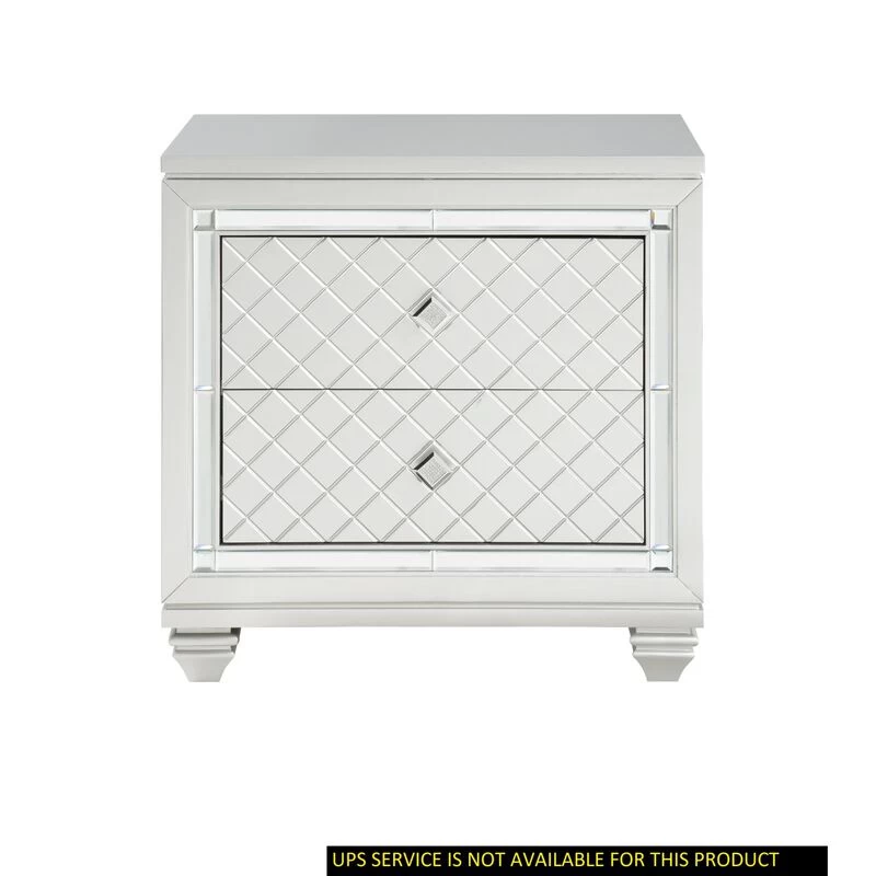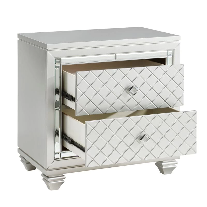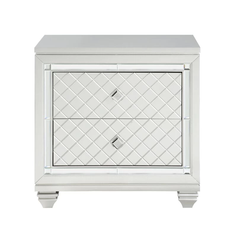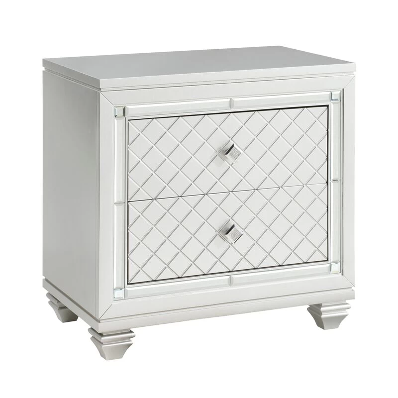 The Leesa Collection is a visually striking set that adds a touch of glamour to any design. The silver-finished nightstand features diamond pattern drawer fronts, mirrored framing, and has overall dimensions of 28.5″ x 18″ x 29″H.