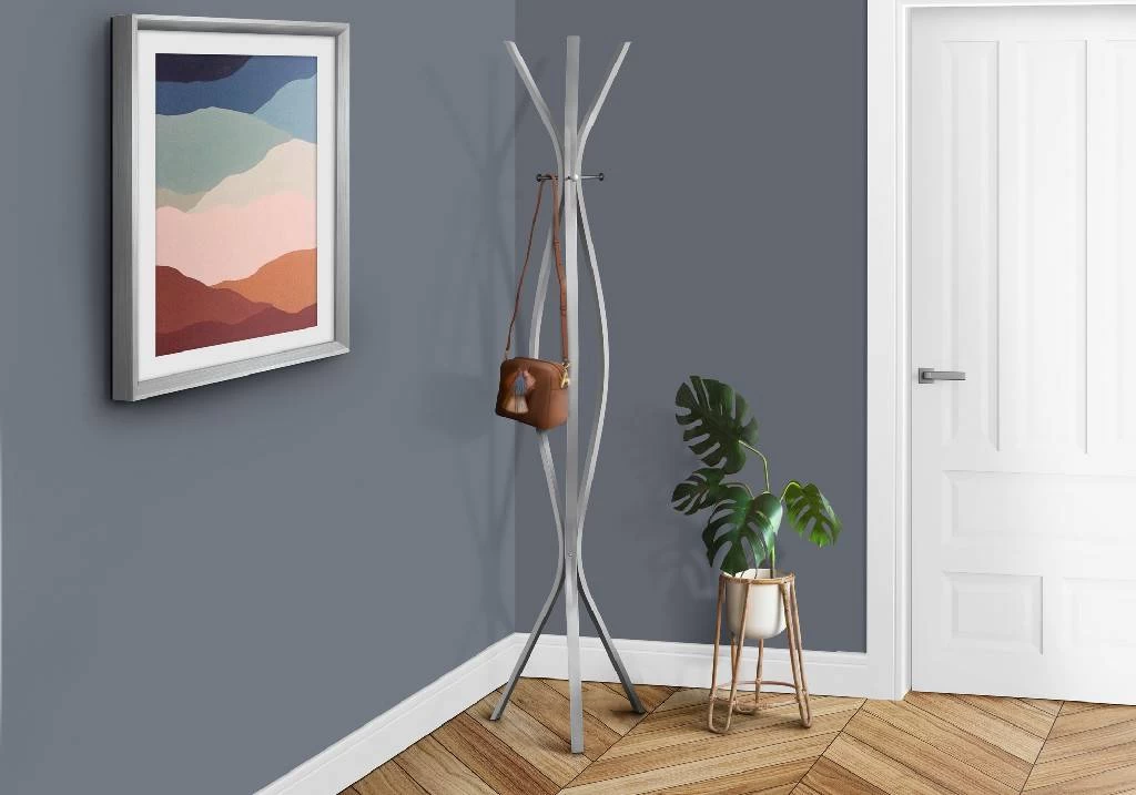 Complete the functionality of your home with this contemporary coat rack. Beautiful 72″ high silver metal legs provide sturdy support and bring plenty of stylish storage into your living space. This coat rack makes it simple to organize your entryway / hallway or . A modern and chic look complete its stylish appeal. Assembly Required.