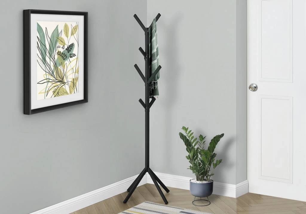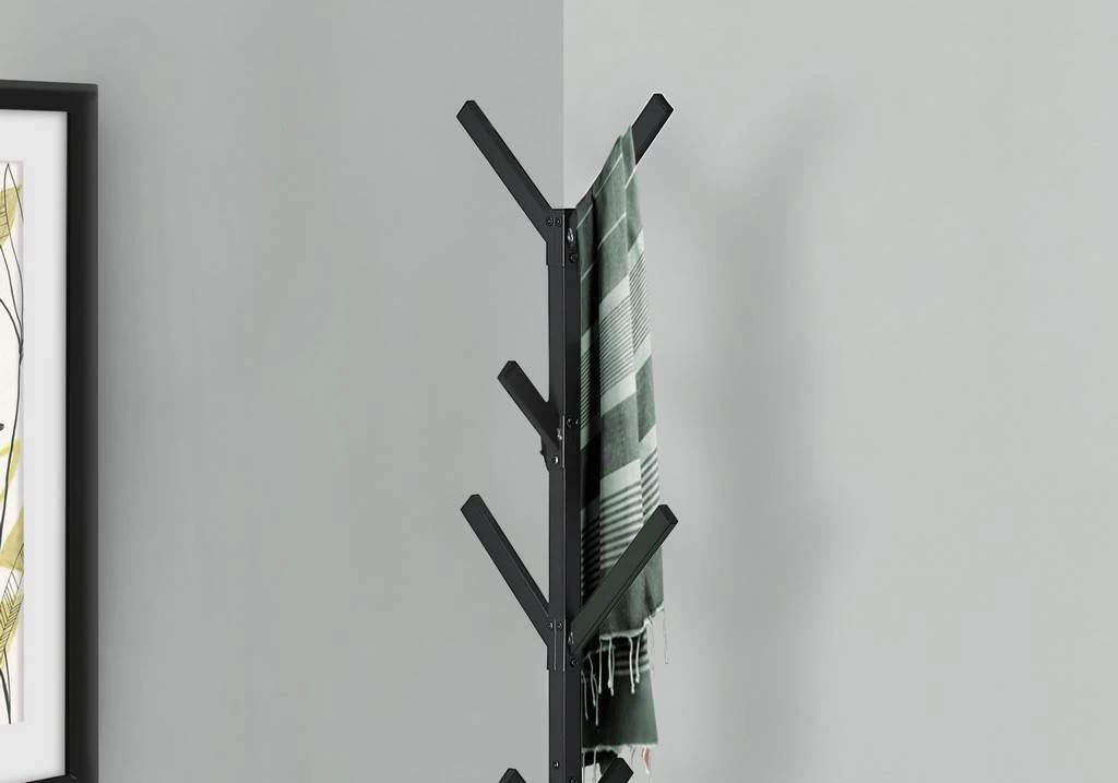Get those coats and scarves off the chair and onto this modern / industrial style metal coat rack! Featuring 4 tiers of 8 hanging hooks that easily hold coats / drape your scarves / or hang some beautiful purses as a unique and stylish storage solution. The sturdy 4-pronged base helps to keep the weight properly distributed. With a bold black matte finish / this coat rack will anchor that corner of your entryway / bedroom / and your office for a strong / contemporary look. Assembly is required.