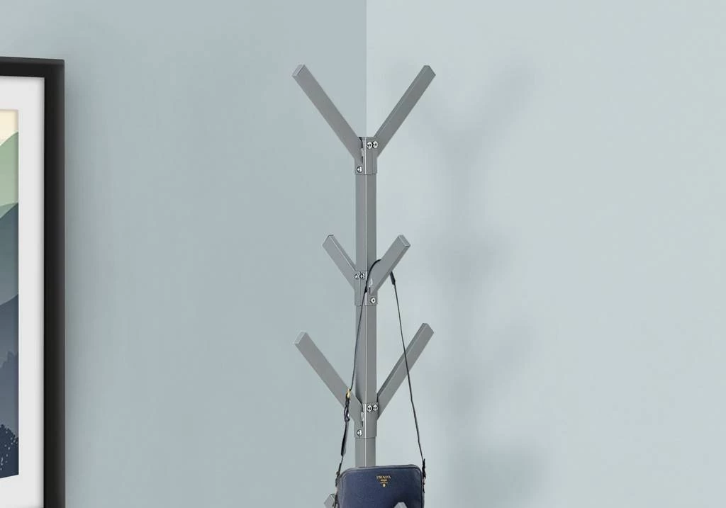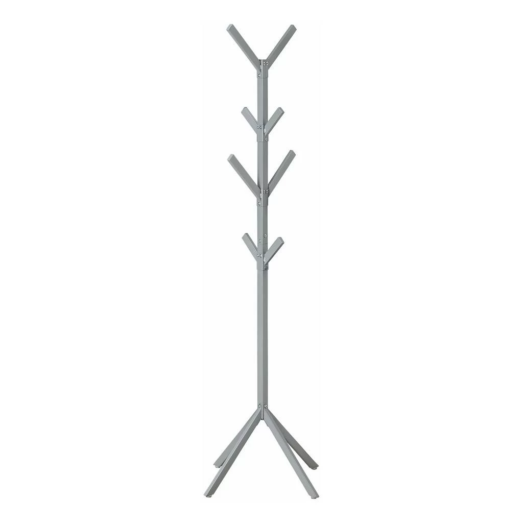 Get those coats and scarves off the chair and onto this modern / industrial style metal coat rack! Featuring 4 tiers of 8 hanging hooks that easily hold coats / drape your scarves / or hang some beautiful purses as a unique and stylish storage solution. The sturdy 4-pronged base helps to keep the weight properly distributed. With a chic silver matte finish / this coat rack will anchor that corner of your entryway / bedroom / and your office for a strong / contemporary look. Assembly is required.