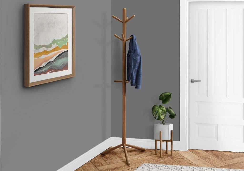 Organize your home with this contemporary solid wood coat rack. A beautiful lustrous oak finish / and a sturdy pedestal base brings plenty of stylish storage into your living space. Its simplicity makes it easy to create functionality in your entryway / hallway or . This tripled tiered coat rack is ideal / convenient and a necessity for all. Assembly Required.