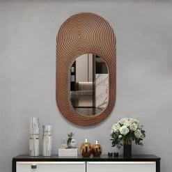 37.4″ Large Brown Oval Wall Mirror Decor With Circle Texture Frame Living Room Bedroom