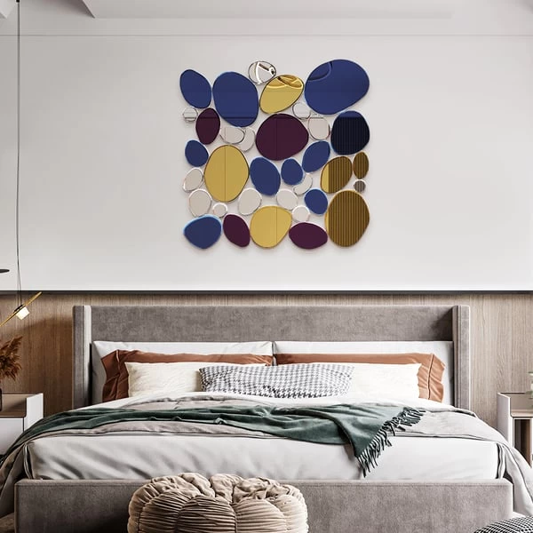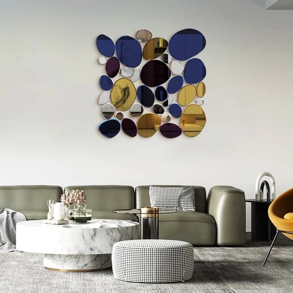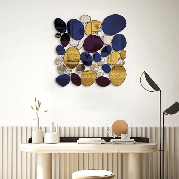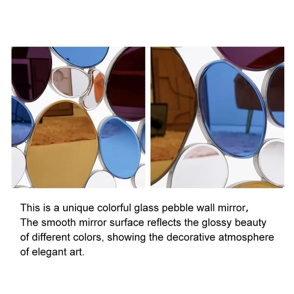 This wall mirror is composed of many colorful pebble-shaped mirrors, which is very elegant and beautiful. It can not only be used as a mirror, but also a good art decoration. It is suitable for living room, bedroom, dining room, entrance or other suitable spaces, and it can also be used as a gift or collection for family and friends.