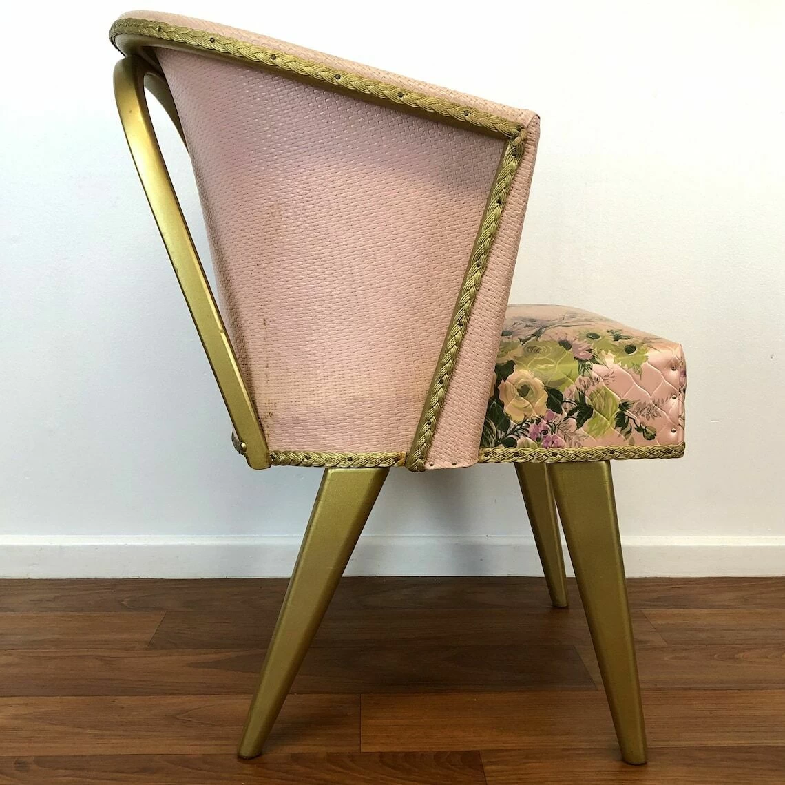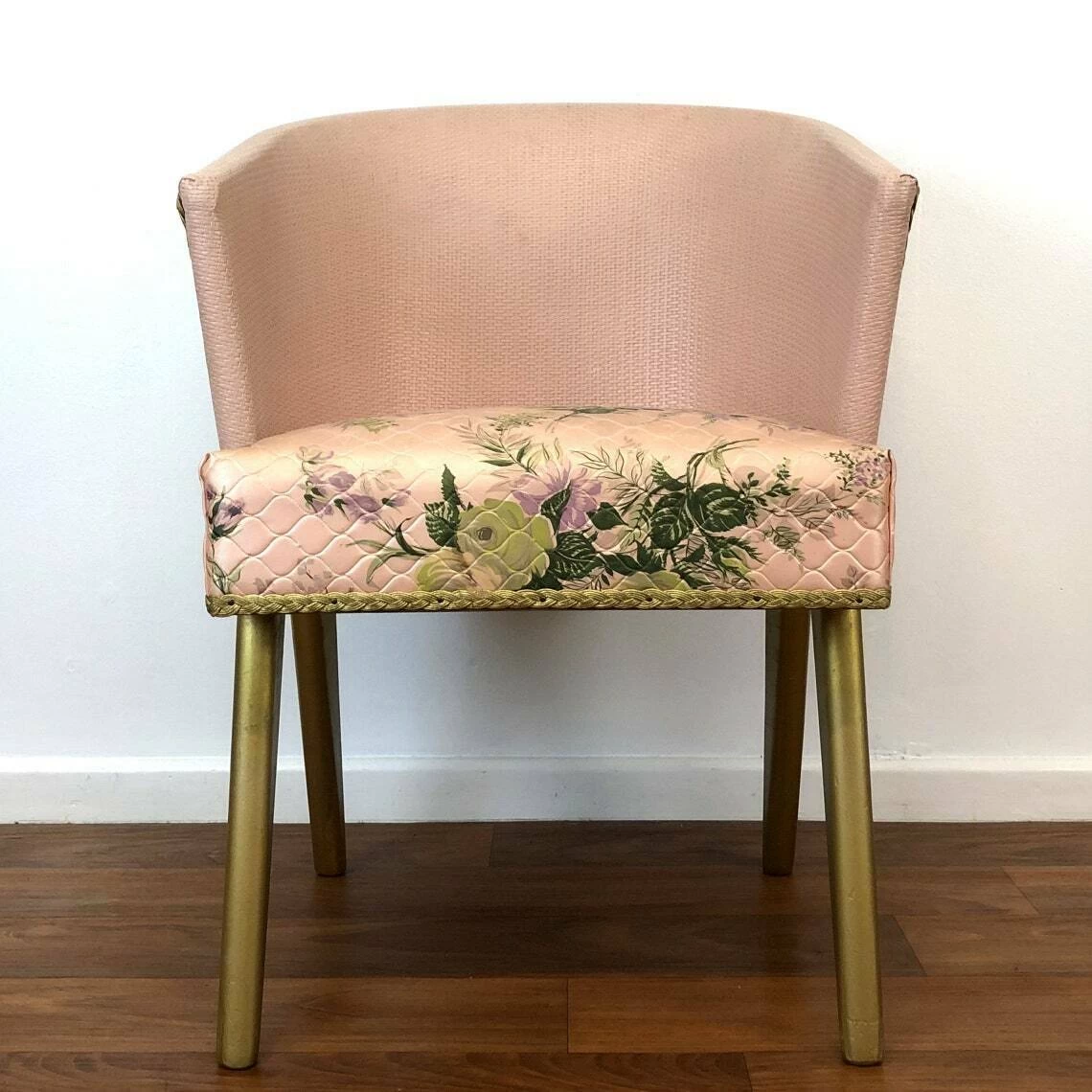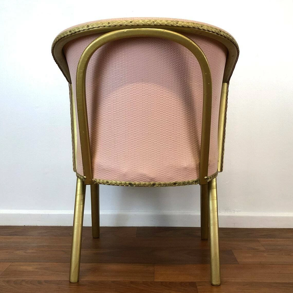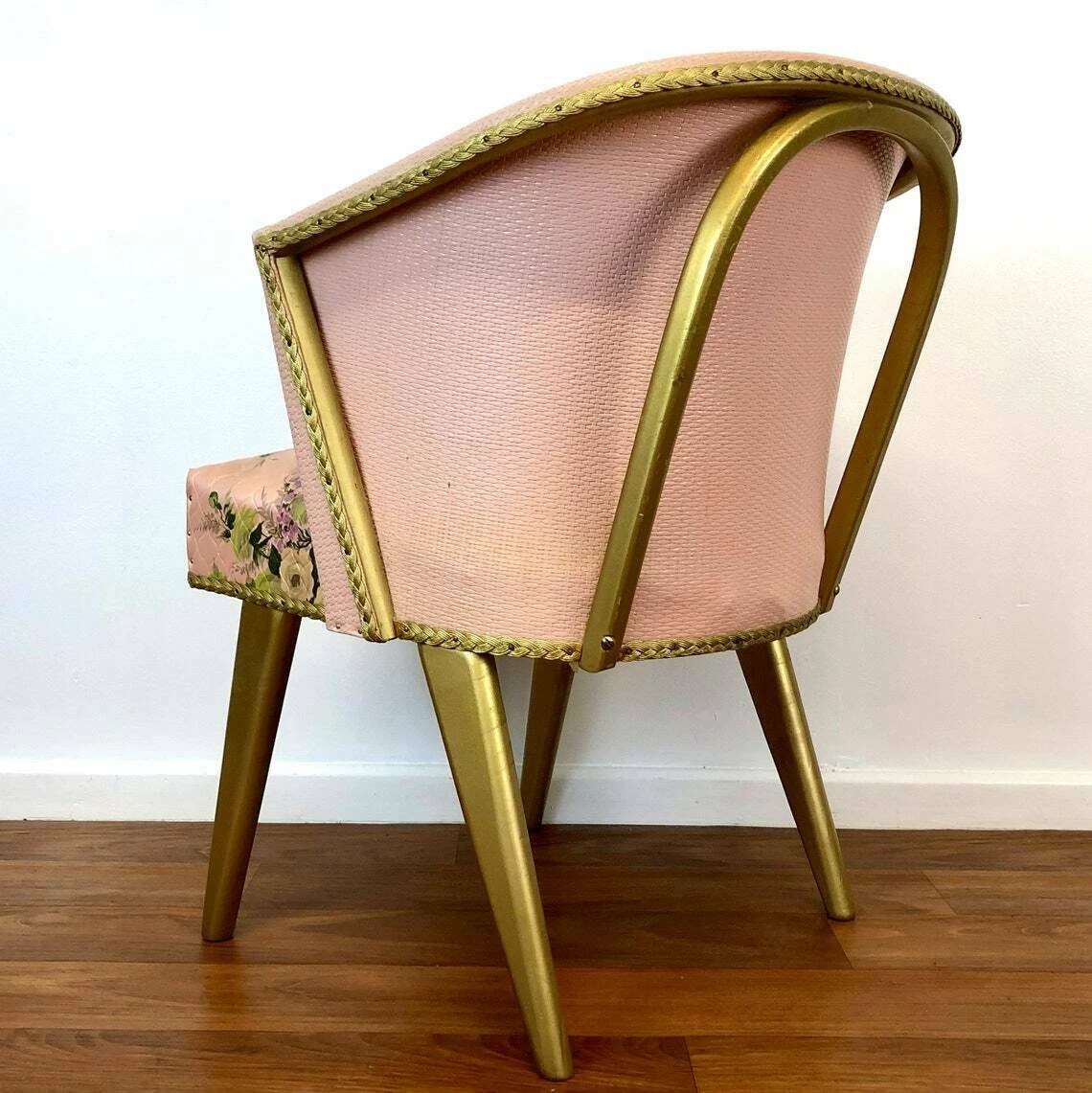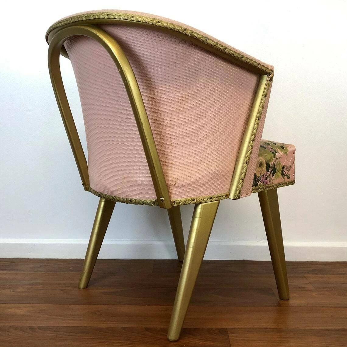 A fabulous mid century pink/gold Lloyd Loom bedroom/cocktail chair with floral decoration, c1950’s, England