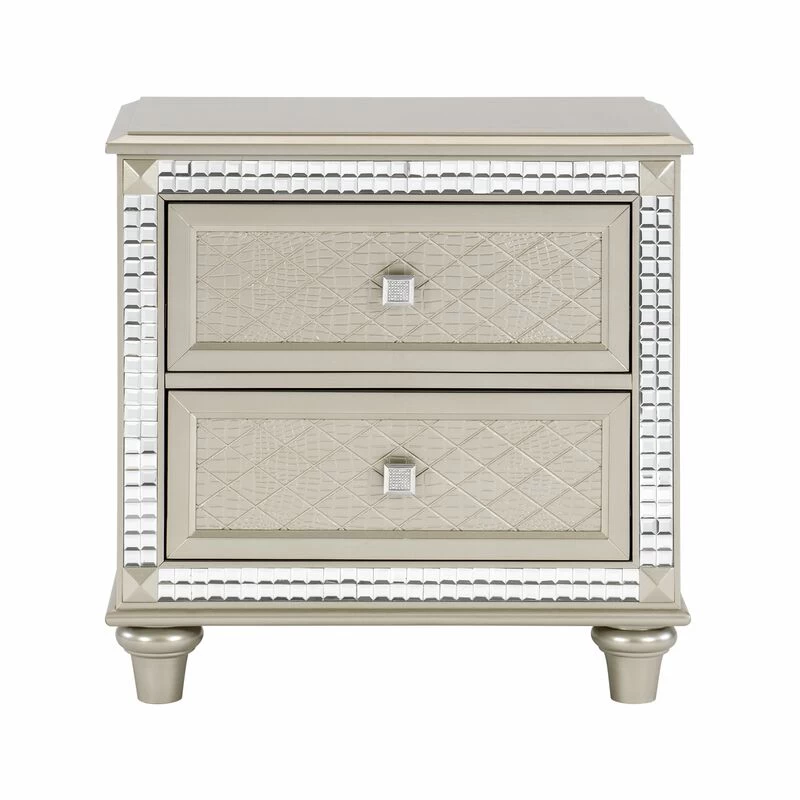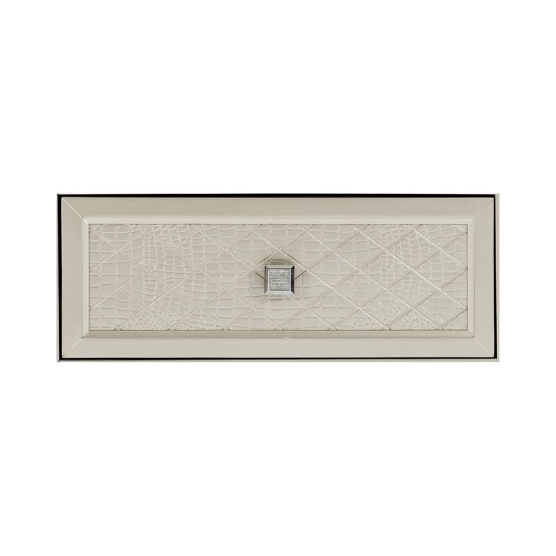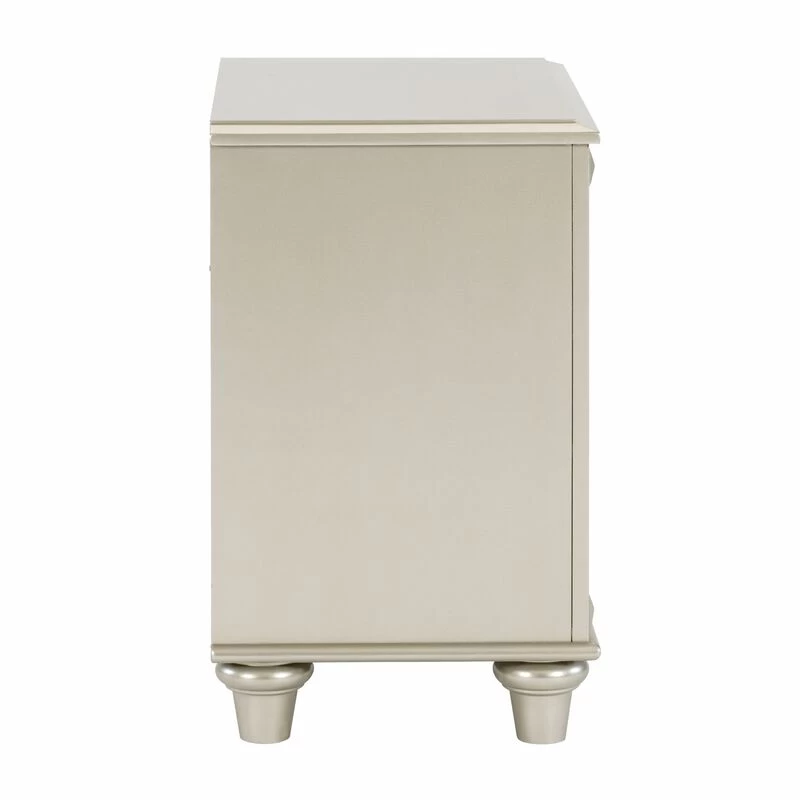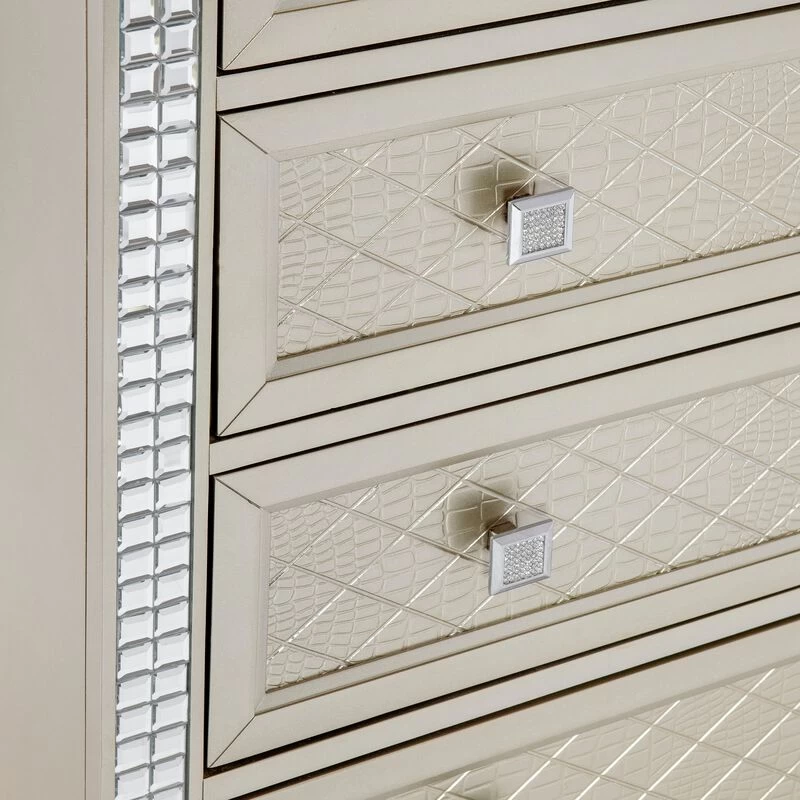 Radiating the iconic beauty of glamorous styling, the Juliette Collection is an elegant addition to your boudoir. The silver finish of the collection is reflected in the mirror trim that defines the profile of the nightstand with its embossed drawer fronts featuring a diamond pattern and crystal-enhanced drawer knobs. The turned feet that support the dresser lend subtle traditional accent while the decorative elements create a glamorous aesthetic.
