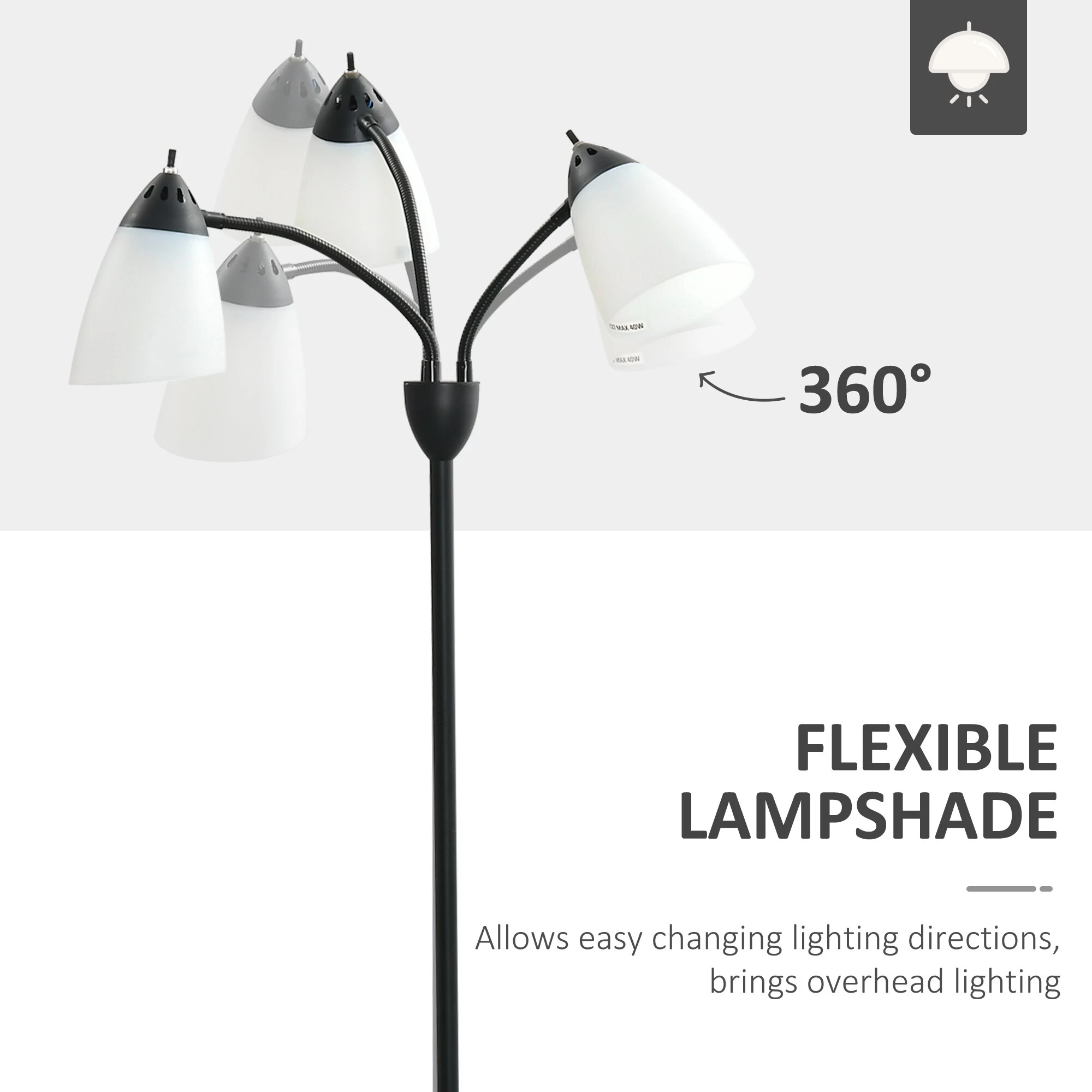 Say no to the normal and let this sophisticated, contemporary lamp accommodate your needs. The flexible stems of each lampshade allow you to bring one light closer to where you need it, share the light with someone across the room from you, point different ones on different things, or shine them all on one spot for extra illumination on one area. HOMCOM’s design offers triple the bright points to see more easily, and helps you set the mood in your home while making the light soft and welcoming. The reinforced base provides high stability and great balance. Use this unique design to make your home brighter and warmer.