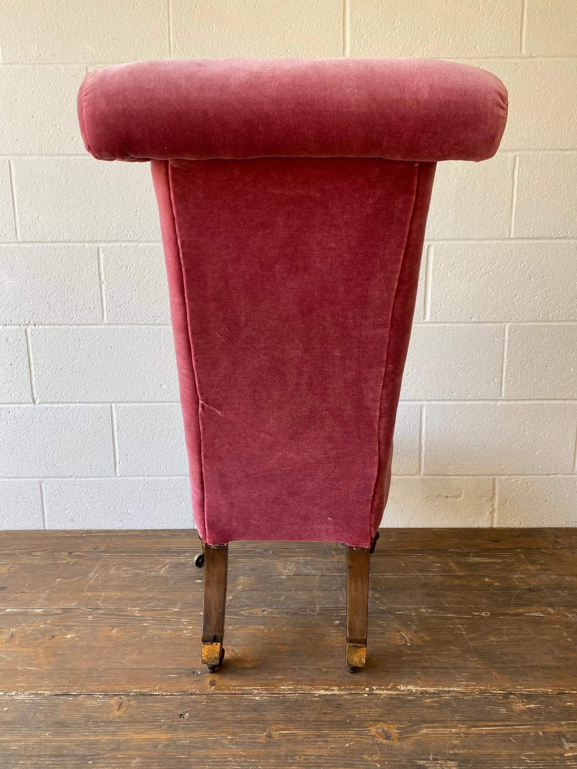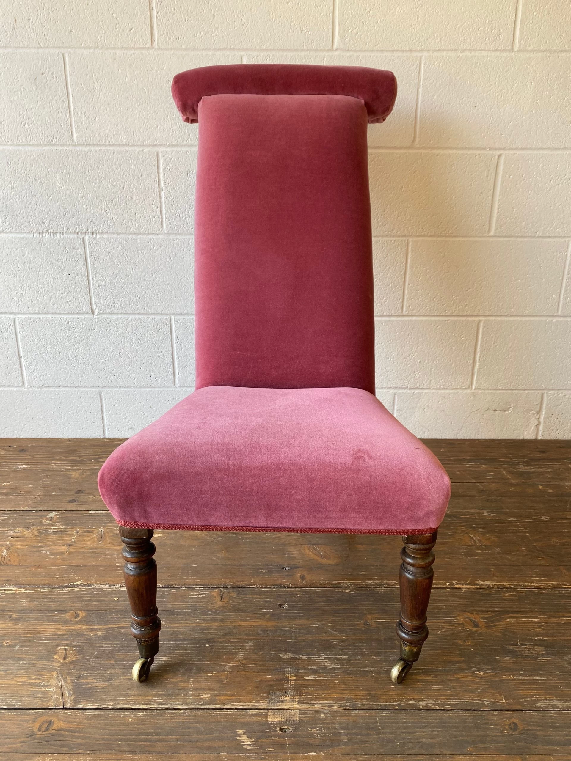 19th Prayer chair with turned front legs and original brass castors, later upholstery is a hot pink velvet. The chair has an elegant shape and would look stunning as an occasional chair in a bedroom.