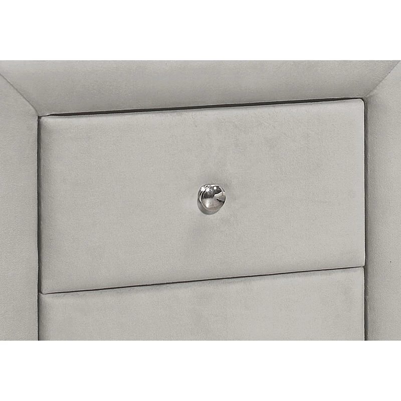 This upholstered nightstand demonstrates how minimalism can be both chic and sophisticated. The timeless and contemporary design emphasizes clean, rectangular lines and smooth surfaces. This bedroom accent features a foam-padded plywood frame, upholstered in light grey velvet-look fabric. The chrome-finished metal drawer knobs provide a contrast to this upholstered side table as an additional style element. This nightstand also features two storage drawers, giving you more places to store items at your bedside. This collection includes a matching bed (available in either Queen, Twin or Full size) which is sold separately.