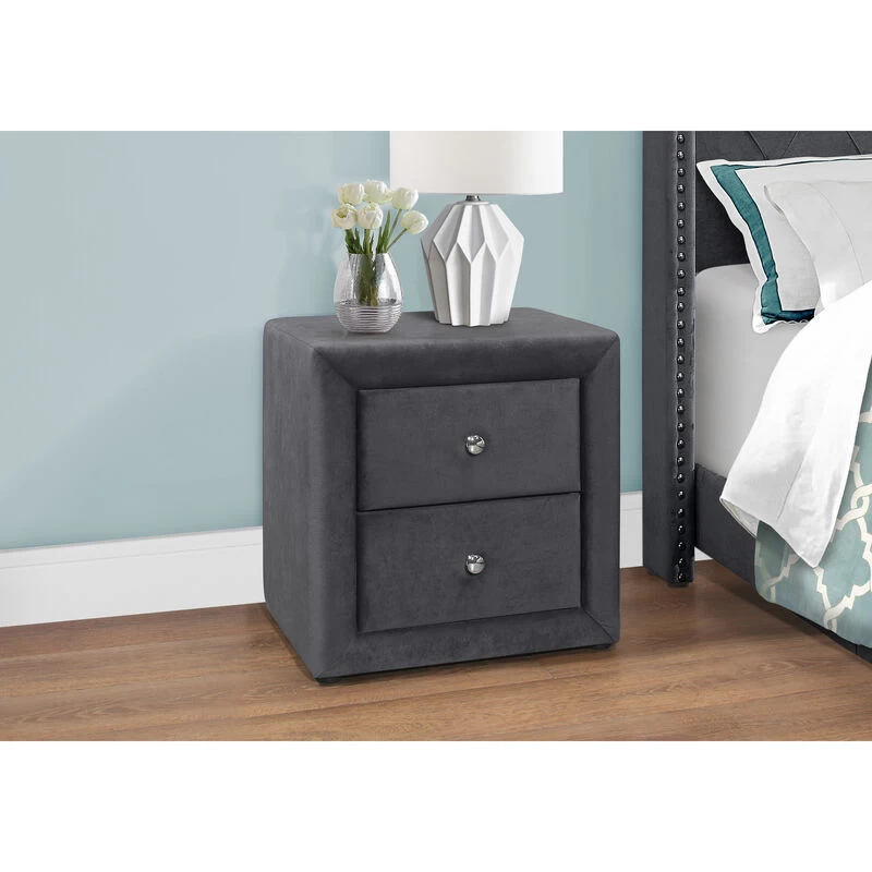 This upholstered nightstand demonstrates how minimalism can be both chic and sophisticated. The timeless and contemporary design emphasizes clean, rectangular lines and smooth surfaces. This bedroom accent features a foam-padded plywood frame, upholstered in dark grey velvet-look fabric. The chrome-finished metal drawer knobs provide a contrast to this upholstered side table as an additional style element. This nightstand also features two storage drawers, giving you more places to store items at your bedside. This collection includes a matching bed (available in either Queen, Twin or Full size) which is sold separately.