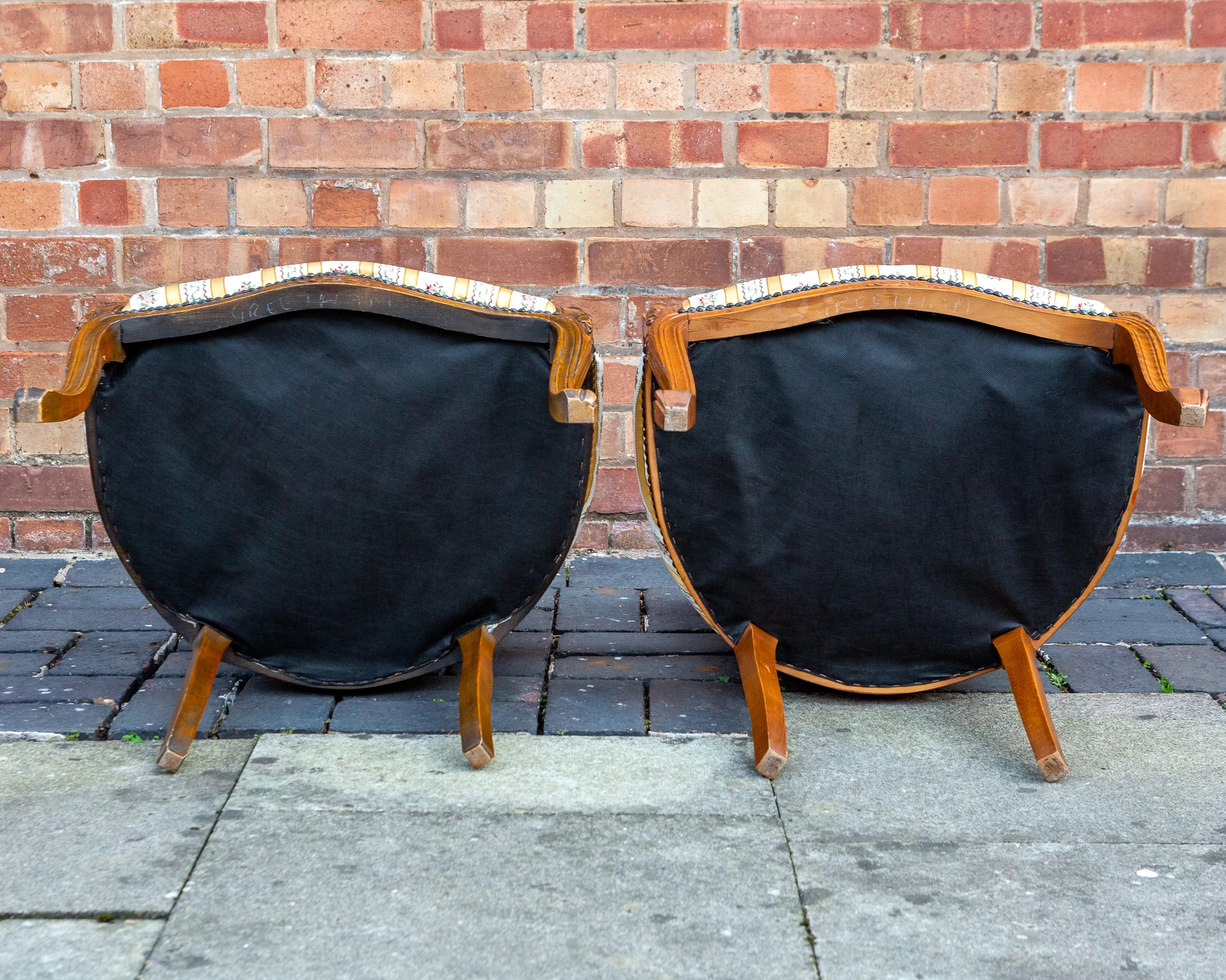 These are in fair-to-good condition. Structurally sound, they have minor to-be-expected marks and knocks to the wood and minor marks to the upholstery, with signs of wear to the upholstery on the arms with age and use. Overall they’re a really charming pair and if well looked after they should be just as elegant for decades to come – please see the photos.