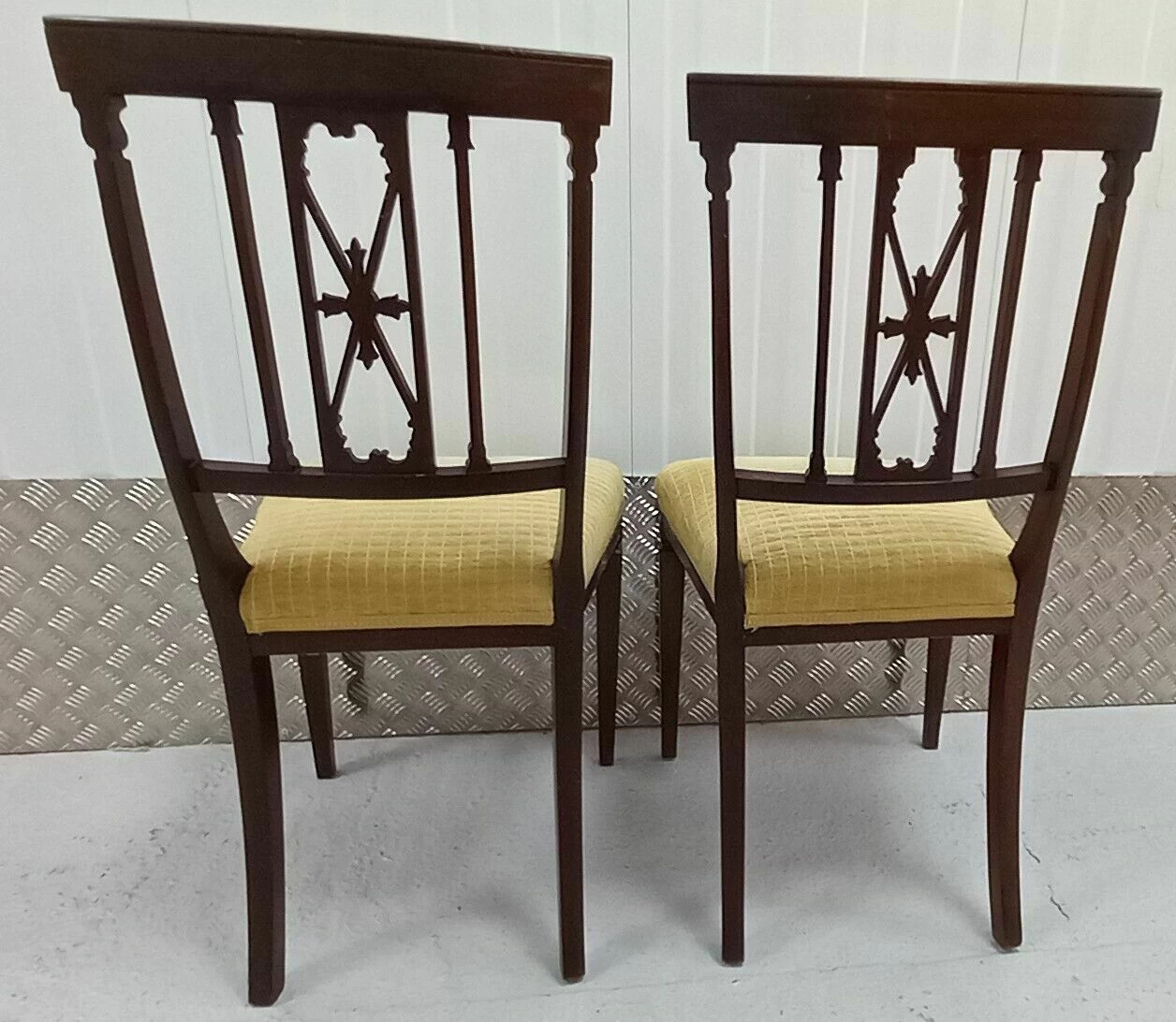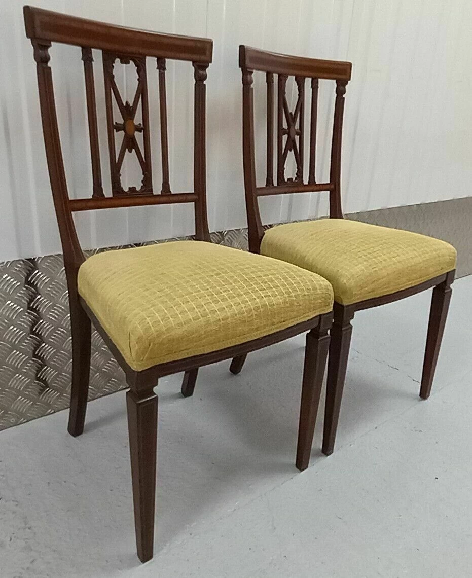 Pair of Edwardian mahogany satinwood banded and boxwood strung bedroom chairs. Wear commensurate with age.