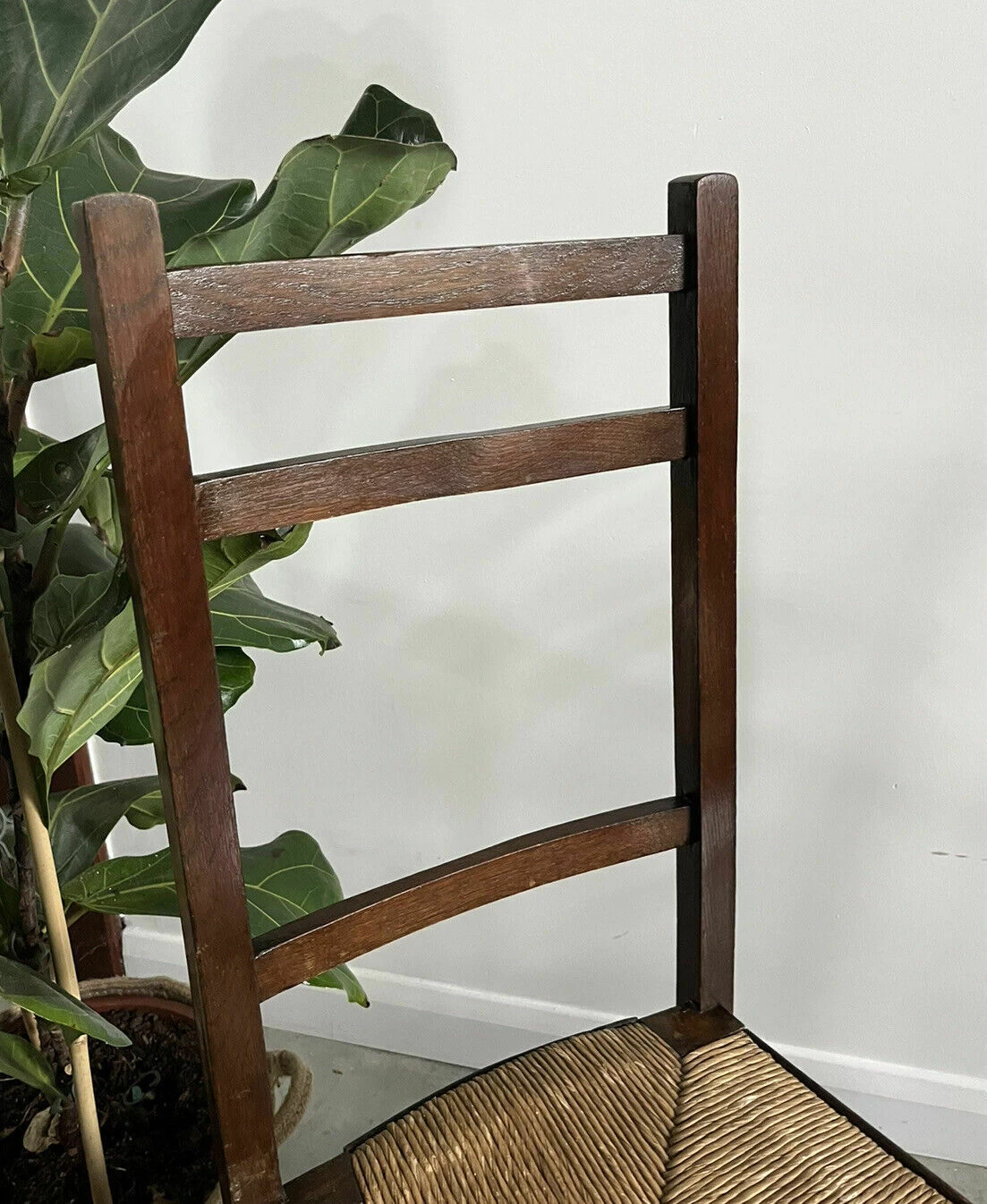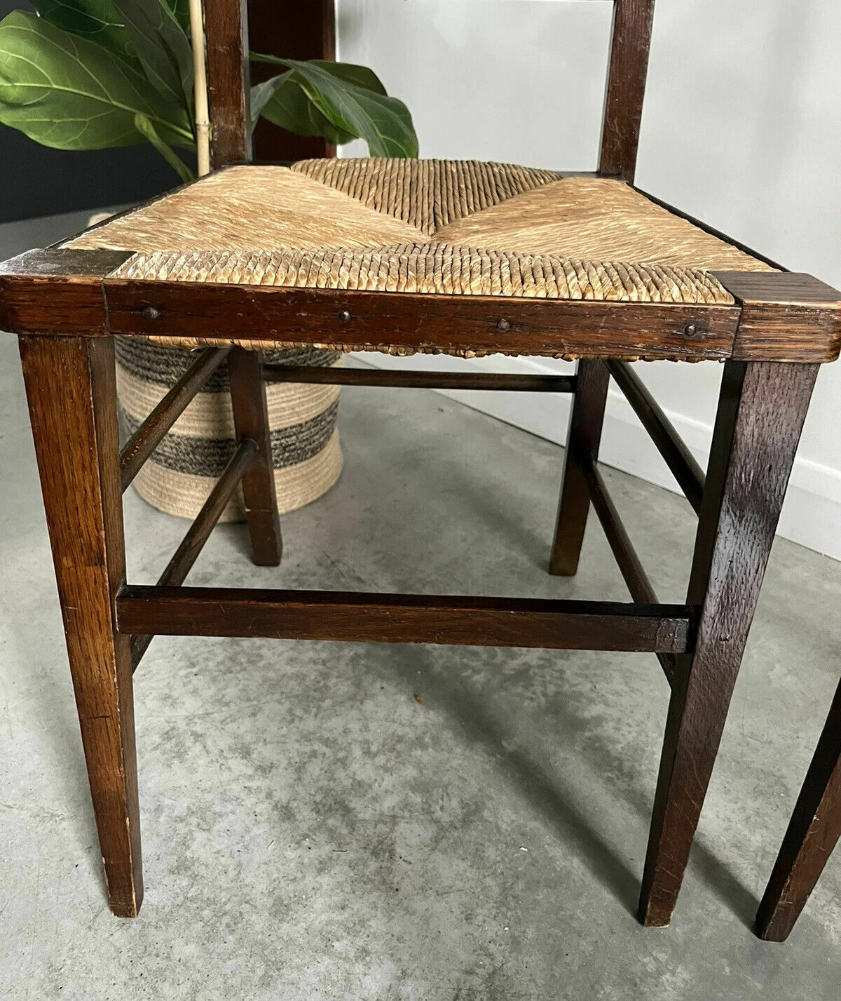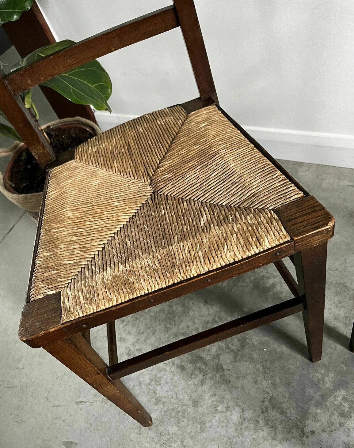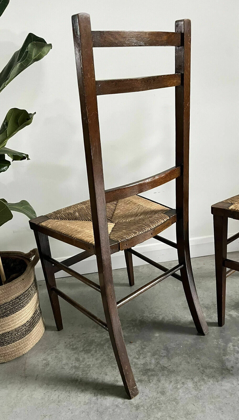 Pair Of Vintage Rush Seat High Ladderback Accent or Bedroom Chairs. Recently sourced from Normandie, France The chairs have a traditional woven cane rush seat with a high ladder back type back rest and are in good sound condition Original nailed detail banding to sides, front and back of the seat pad. Perfect as bedside chairs or accent chairs in a hallway