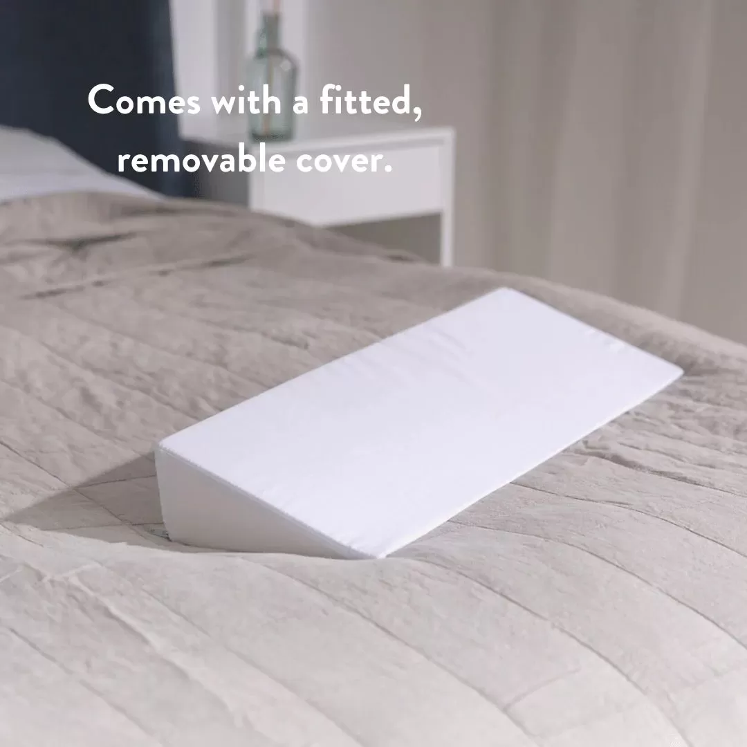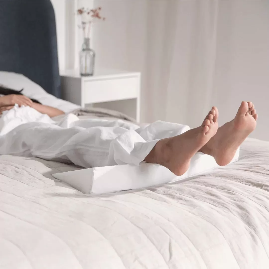 This triangle pillow can be used under the lower leg to lift the heel off the bed.