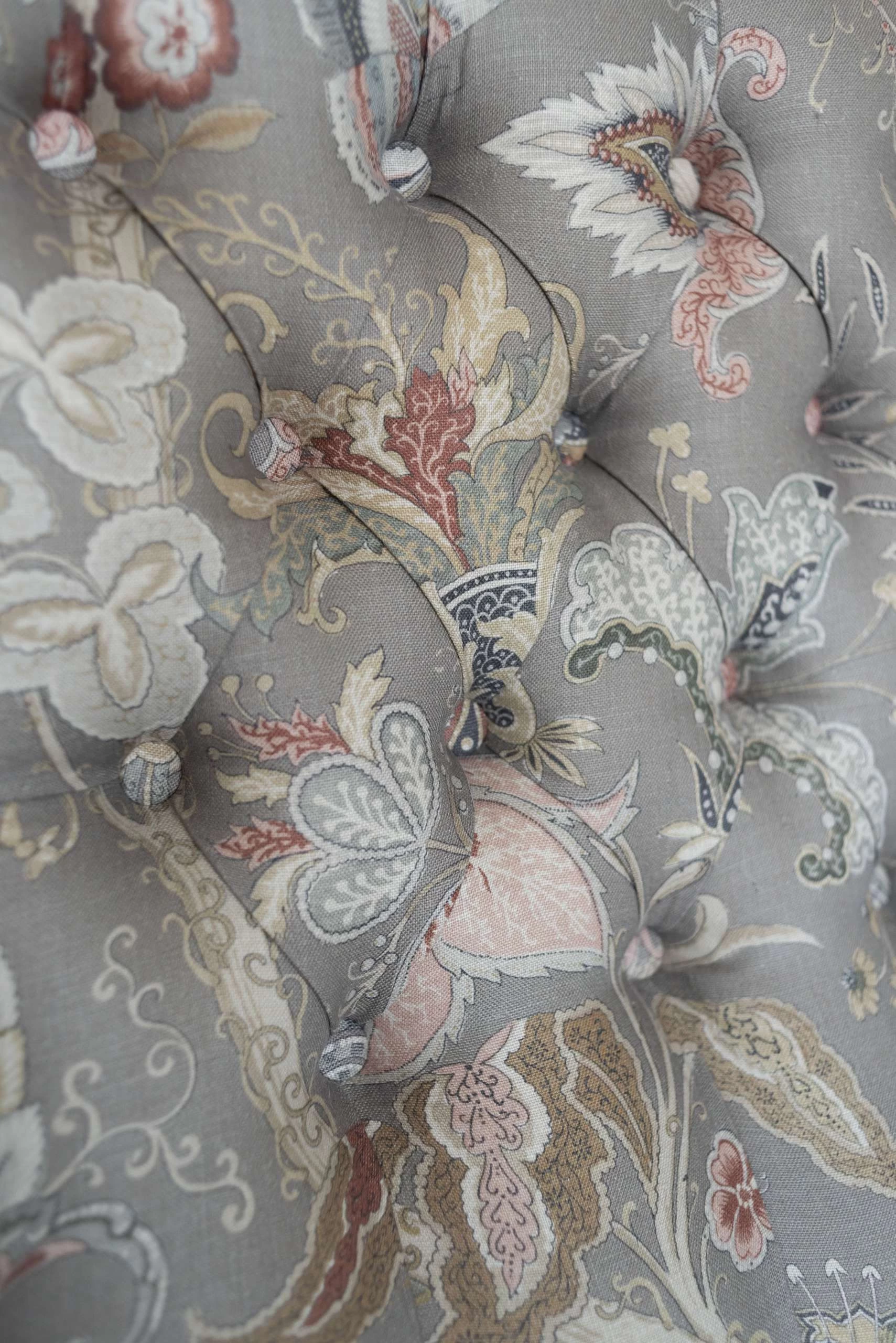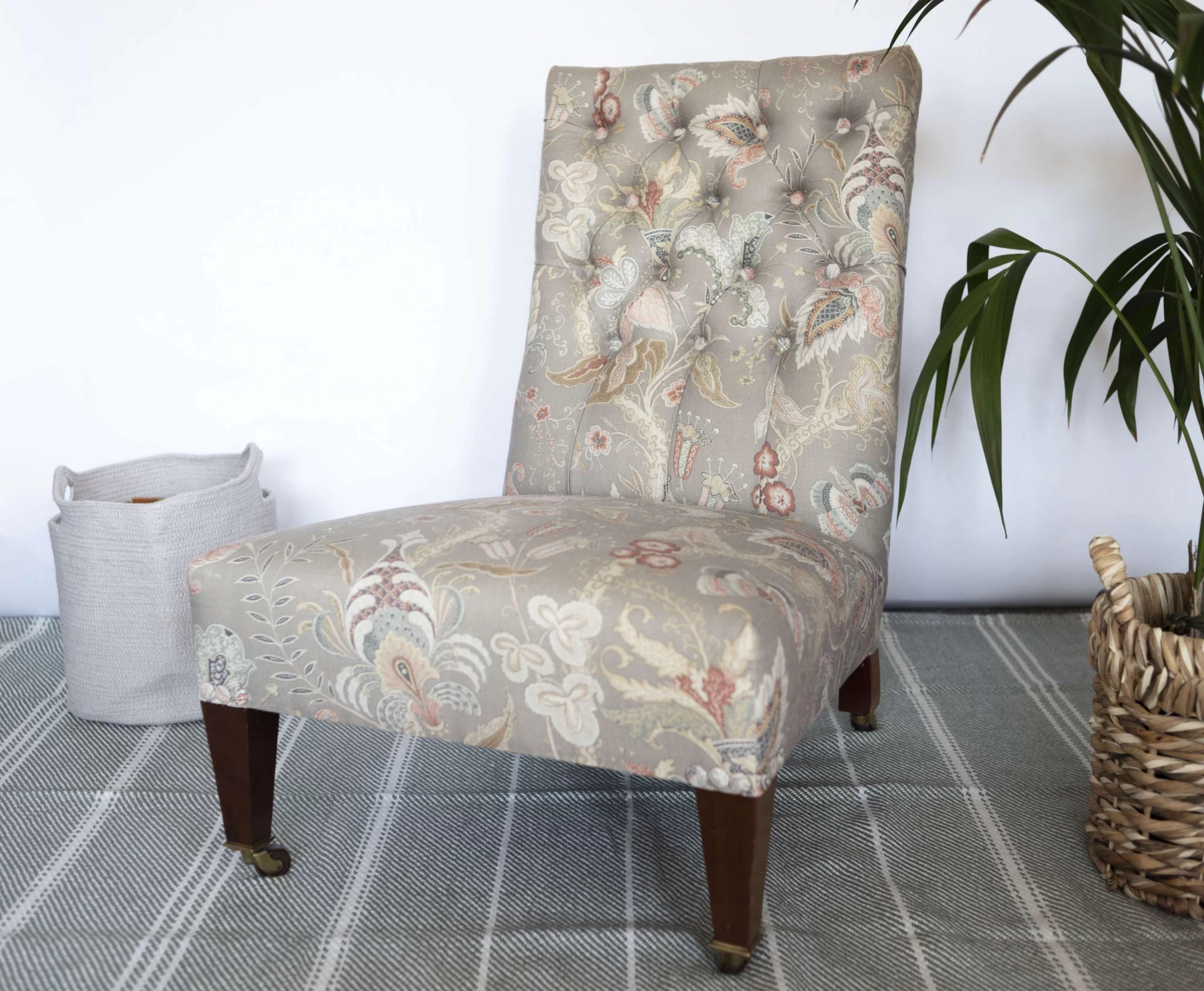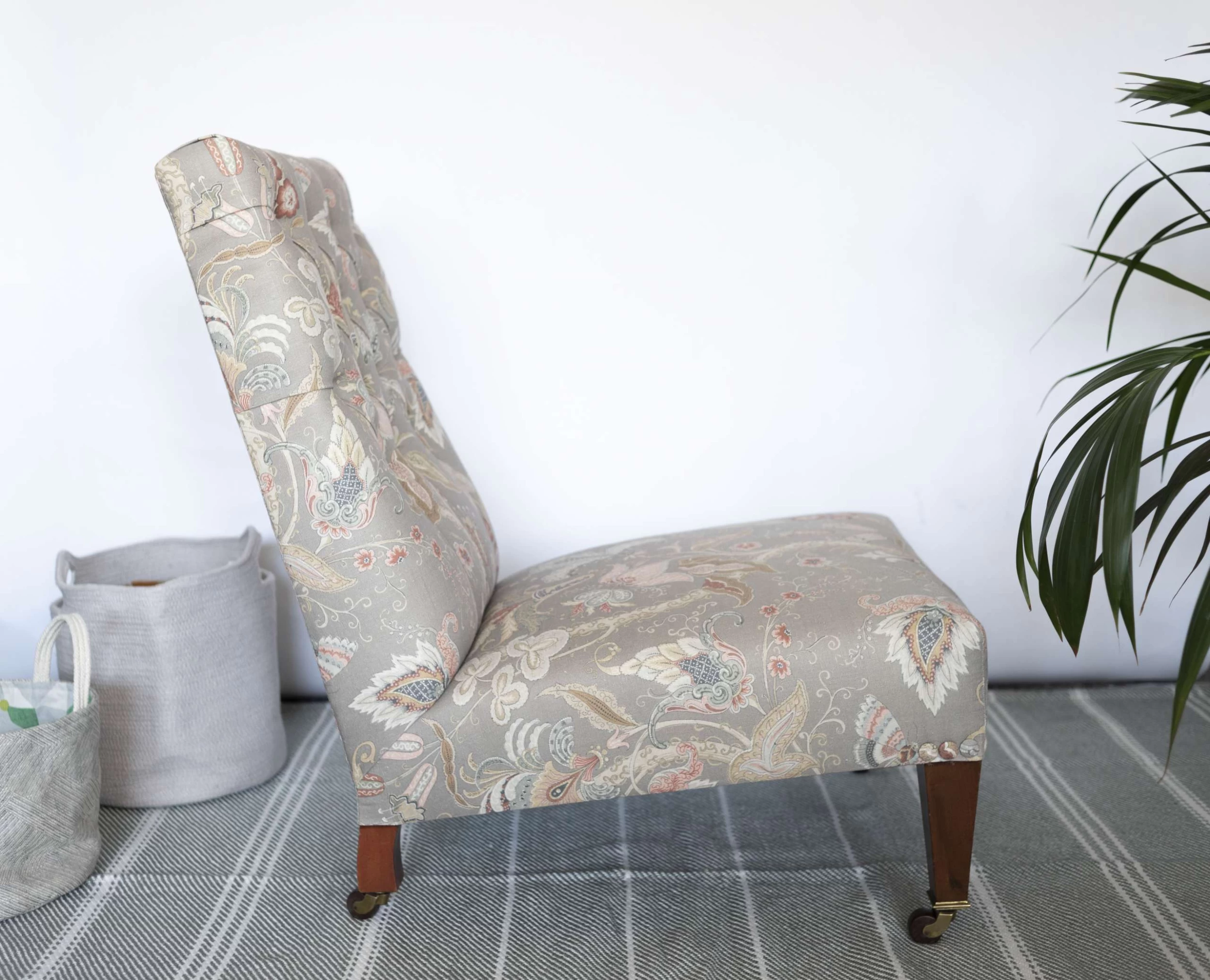 This is a beautiful low bedroom chair covered in a pretty grey/pink/cream floral linen mix fabric which would suit the most romantic of interiors. With it’s deep buttoning and pretty decorative button detail around the legs it is beautifully finished. Polished walnut legs are encased in brass fittings and sit on original brass castors which give it a bit of class. This is a traditionally upholstered chair by an AMUSF fully qualified upholsterer and will last another lifetime if looked after.