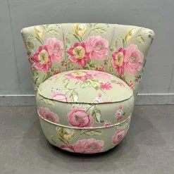 This listing is for a single 1920/30s bedroom chair. The chair dates is a fabulous thing, very pretty and Cindy. It has a lovely shape which envelops you, being round it sort of wraps round you. The seat is quite deep which allows you to get really comfy. It is newly upholstered in a Clarke & Clarke floral upholstery weight cotton. This is lovely, a pale cool green with pink roses on, it’s just really very pretty. The chair has been newly (professionally) upholstered and care has obviously been taken over the placing of the fabric because the floral design is centrally placed on the seat and other pieces, making it balanced and nice to look at. The chair stands on its original small brass castors which roll quite well, not super smooth, these were designed for movement if necessary rather than for rolling around the floor like in an office chair. The castors are hidden from view mostly – unless you look underneath the chair for some reason. I just love this, it’s so nice, fresh looking and pretty. The chair is in great condition, nice and sturdy with no loose bits or wobbles. The arms and castors are firmly attached. It is quite heavy, it has a solid wood frame and has been reupholstered using traditional upholstery techniques. The design of the chair is also traditional and these bedroom chairs are still comfy today. It is quite low, made for sitting in to put stockings or shoes on easily, and for looking pretty on if that’s still telavent these days. Regardless of that it remains a lovely chair and should last another 100 years if looked after.