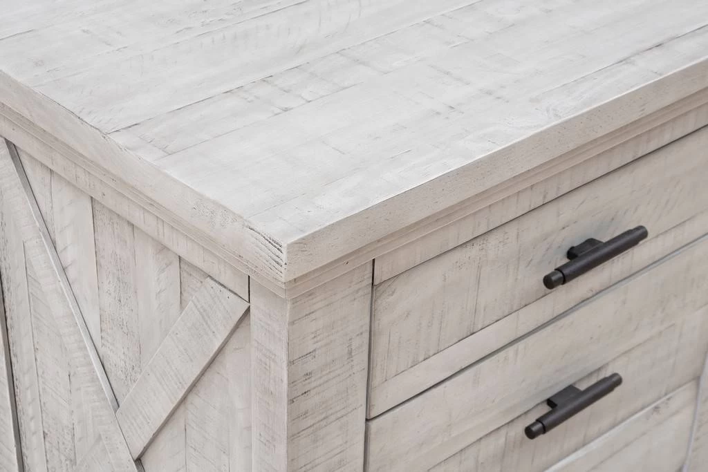 An updated take on a classic farmhouse theme, contemporary calming gray, wainscot panels and X accents provide charm and depth with rustic appeal. Decorative molding conveys traditional elegance, creating a casual chic vibe while solid metal black drawer pulls set an industrial standard. You will sense the rich, organic quality of solid New Zealand pine and Acacia wood, each piece hand rubbed, exposing natural grains and distressing. Country cottage, coastal or shabby chic, any accessories and colors you love will blend with this neutral bedroom nightstand. Update your beach house, liven up your city loft, the configurable Crossing Barn Bedroom Collection will add warmth and transitional style wherever you call home. The manufacturer backs this well-made furniture with a two year warranty.
