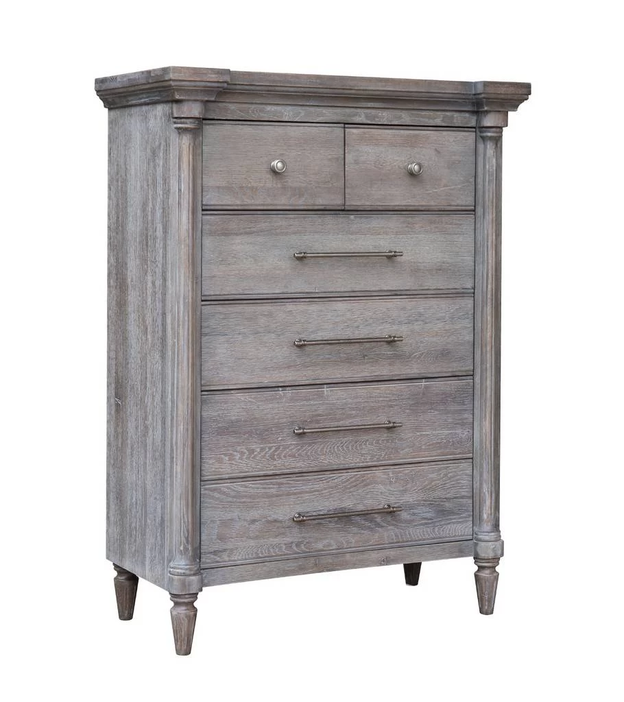 Impress your guests with bedroom furniture that will melt the stress of the day away, create a sleeping sanctuary that is cozy and serene, just dream. Curved edges combined with the inviting upholstered headboard and footboard add movement and delight, giving any bedroom in your home French country insight. Wire brushed gray and taupe finish adds warmth to the solid American oak, enhancing depth and variation to the wood grain. Soft close drawers with English dovetail fronts and backs are corner blocked for added strength. Whether your bedroom leans towards farmhouse, coastal or shabby chic, this transitional casual and elegant bedroom collection will keep your style at its peak.