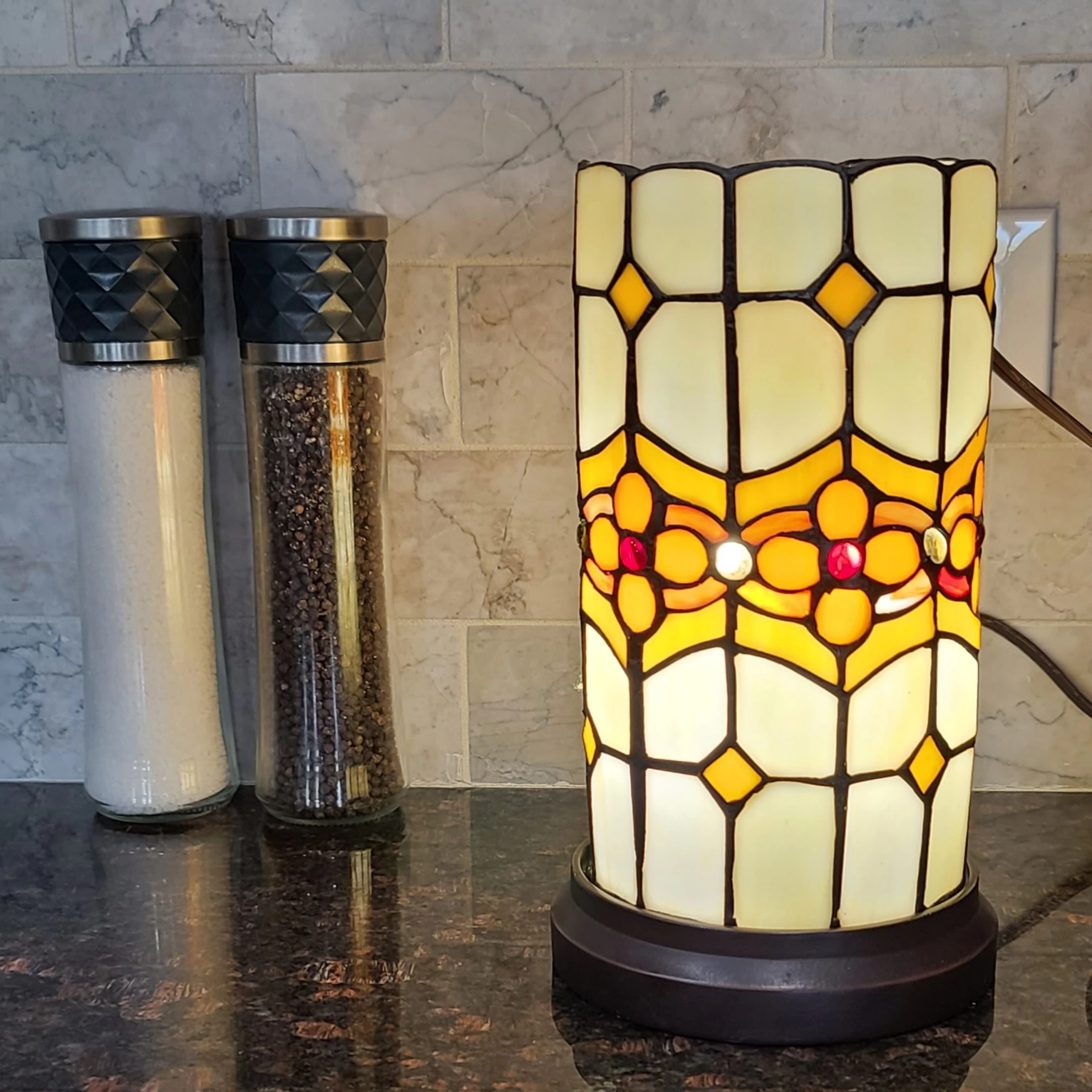 Illuminate your home with this stunning Tiffany-style accent lamp. Handcrafted by skilled artisans using the traditional technique developed by Louis Comfort Tiffany in the early 1900s, this lamp features a beautiful glass shade adorned with a simple yet elegant floral pattern in red. The dark brown metal base adds a touch of sophistication to any room in your home.