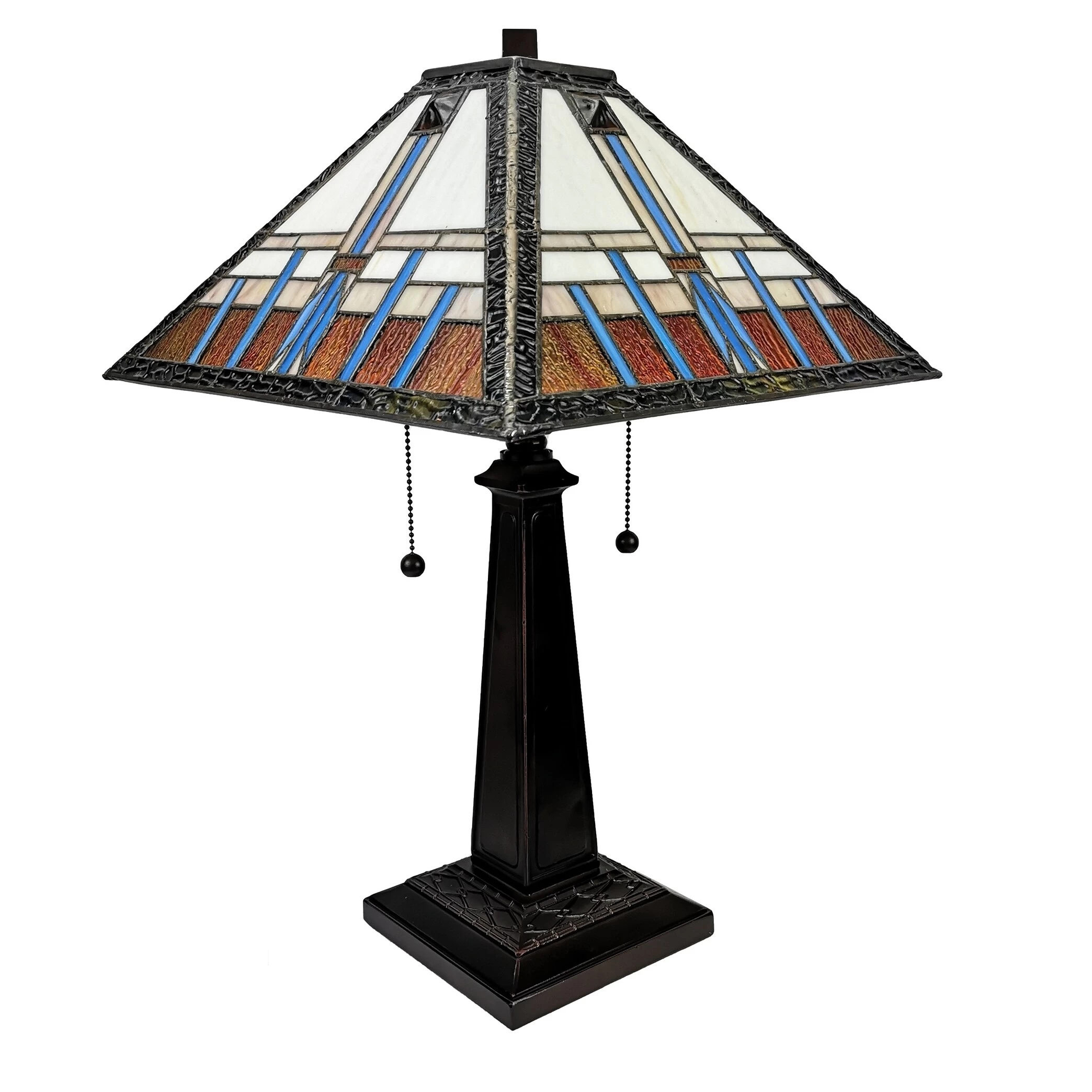 With warm tones and classic lines, this Amora Lighting table lamp is a beautiful mission-style piece. This Tiffany Style lamp is handcrafted using the same techniques that were developed by Louis Comfort Tiffany in the early 1900s.