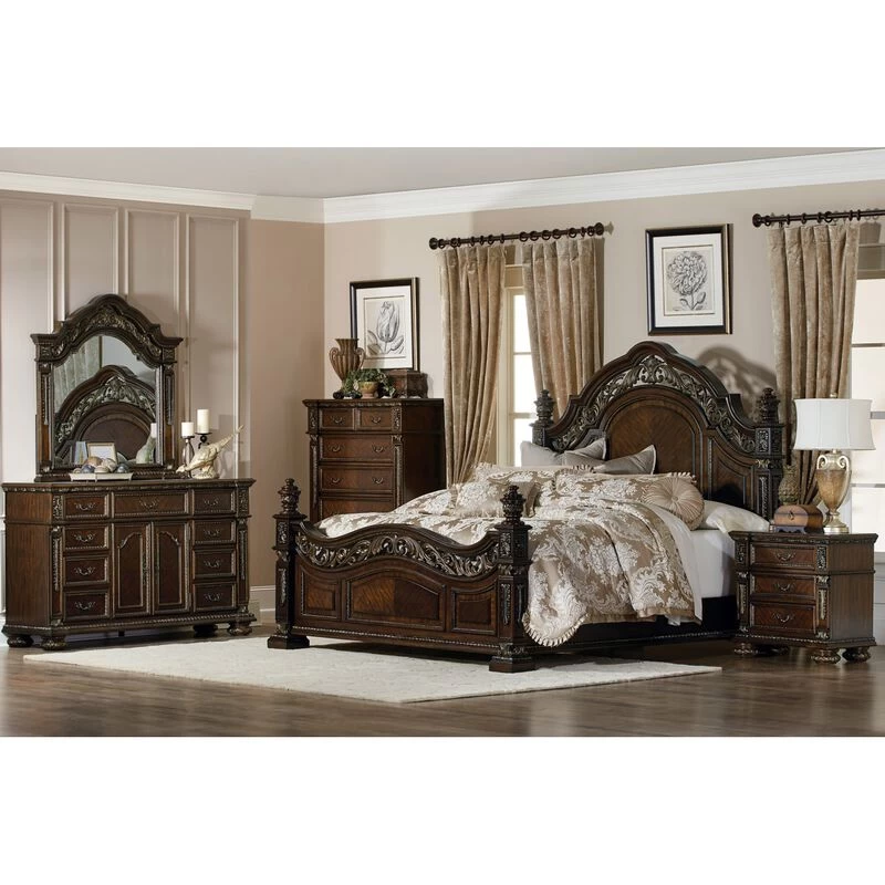 The Catalonia Collection is a traditional and elegant bedroom set with Old-World European styling. It features intricate design elements, a cherry finish, and dark bronze hardware, and includes a nightstand with three drawers.