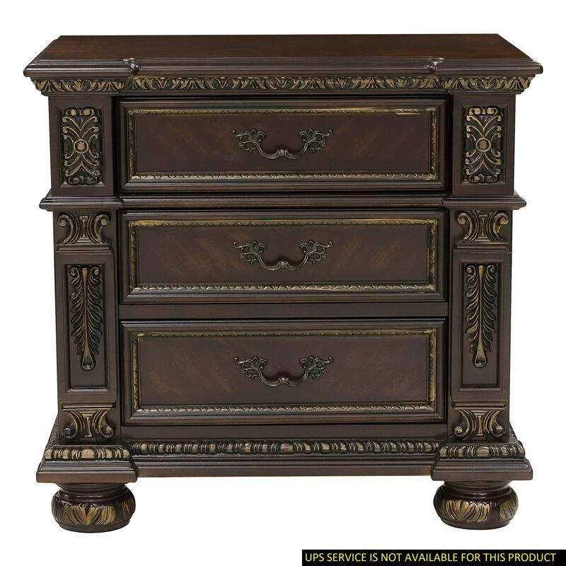 Old-World European styling is captured in the dramatically elegant Catalonia Collection. Traditional design elements reign at every turn – egg and dart molding, acanthus leaf carving, bead molding, gold tipping and extravagant carvings – creating a sophisticated look for your bedroom. Each drawer front features dark bronze fixed-drop hardware with decorative flourish that furthers the elegant appointments that embellish this collection. A traditional cherry finish is utilized to highlight the cherry veneer of the set and decorative inlay patterns found on the nightstand top. PRODUCT DIMENSIONS: – Overall Dimension: 31″ x 18″ x 29.5″H Drawer interior: 18″ x 13″ x 4″ (2); 18″ x 13″ x 5″ (1) Listing Includes: – One Nightstand Only Simple Assembly Require.