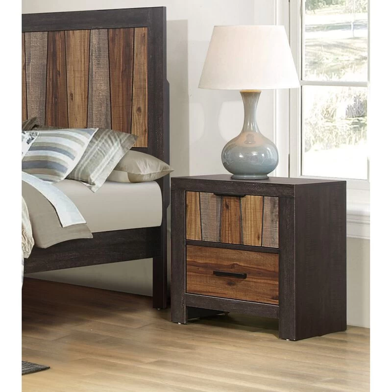 The distinct styling of the Cooper Collection will be the perfect fit for the modern industrial look you wish to achieve in your bedroom. Utilizing embossed faux-wood veneer, the unique 4-tone style, of the nightstand, accentuates highs and lows of dark and light acacia as well as the rich tones of dark ebony and rustic mahogany faux grains. Dark metal hardware provides complementing contrast to the drawer fronts.