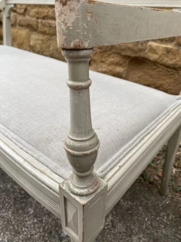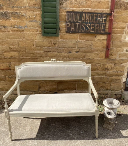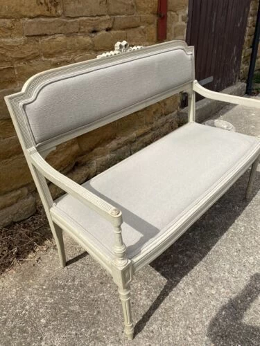 An exquisite and well proportioned painted pine French salon bench settee, upholstered in a fine quality linen, dating from the early 1900s.