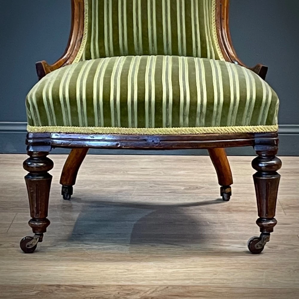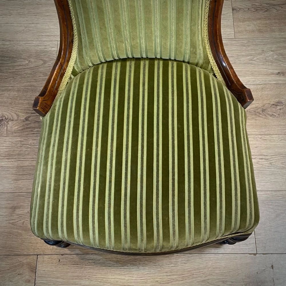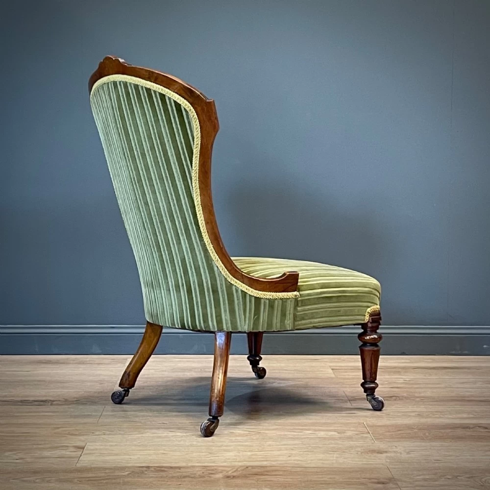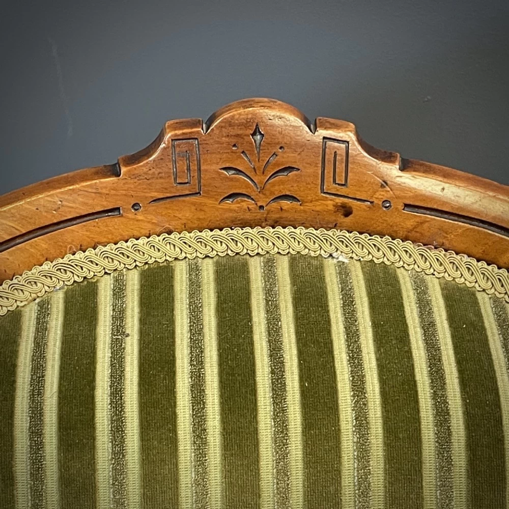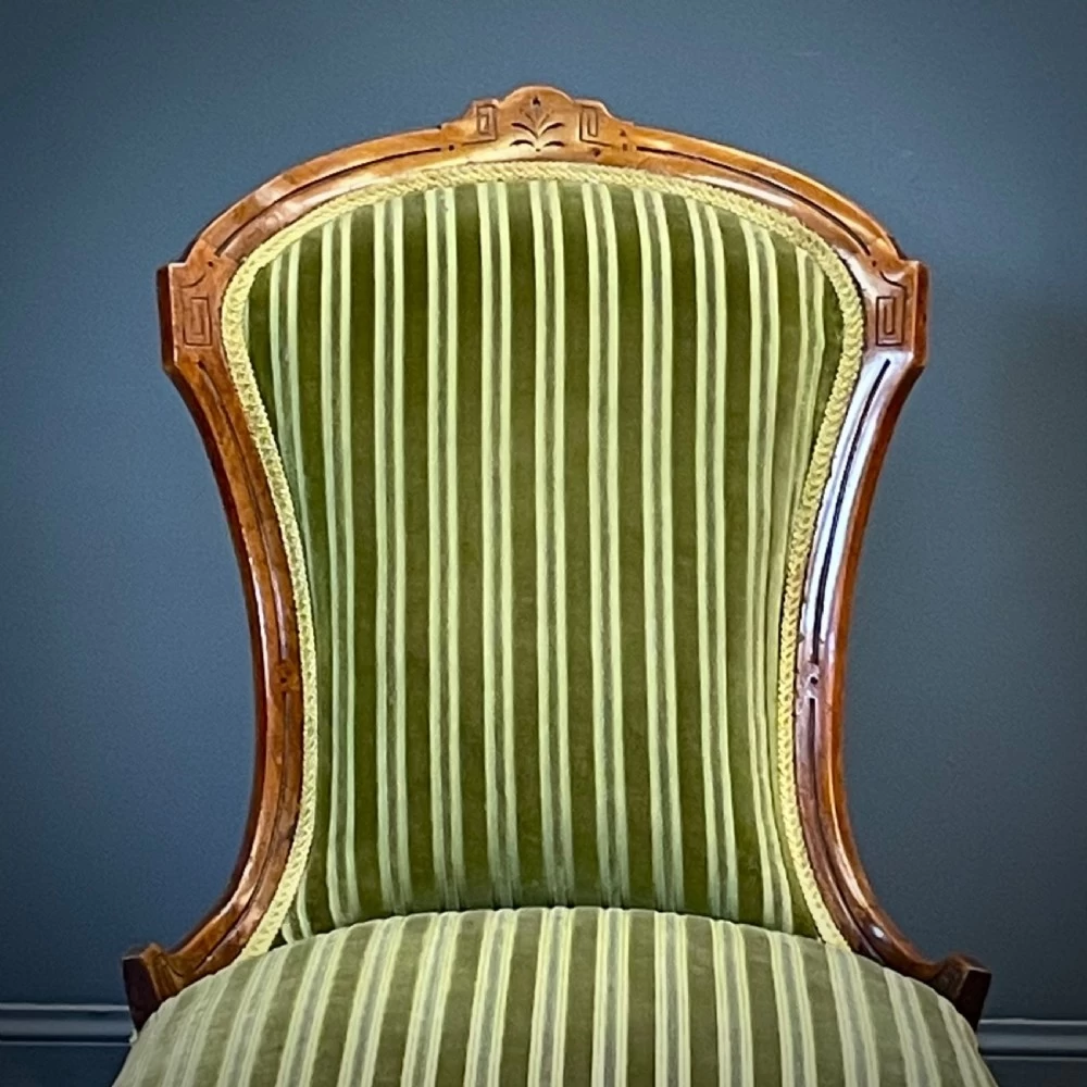 The carved backrest frame curves down to the rear sides of the seat pad. The chair is upholstered in a striped green velour material.