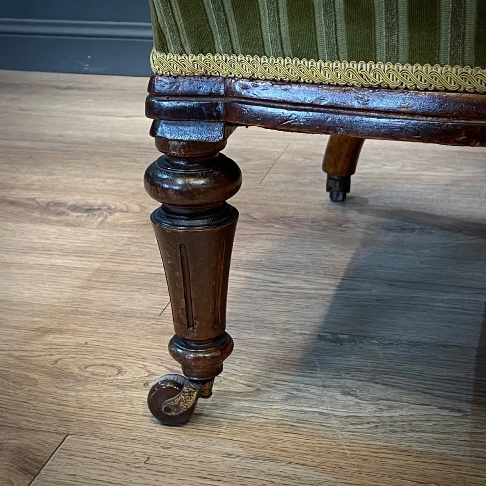 The chair sits on two turned legs at the front and backward curved legs at the rear, the legs sit on ceramic castors.