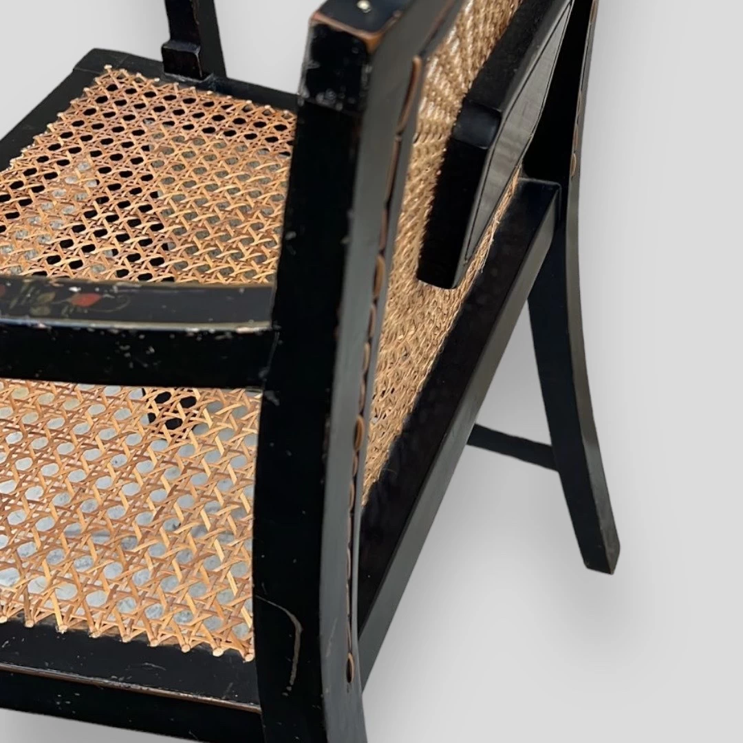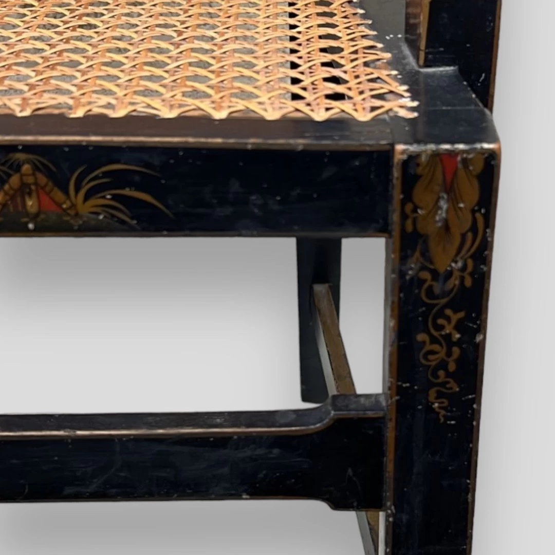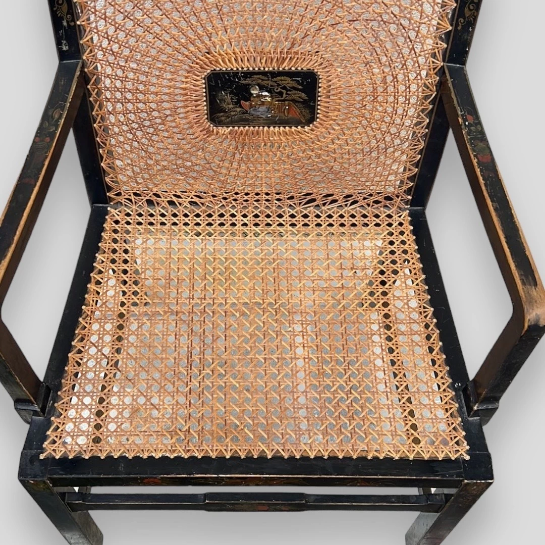 A delightful, mid 19th C , Chinoiserie Decorated , Black Lacquered and Bergere Panelled Bedroom Chair.
