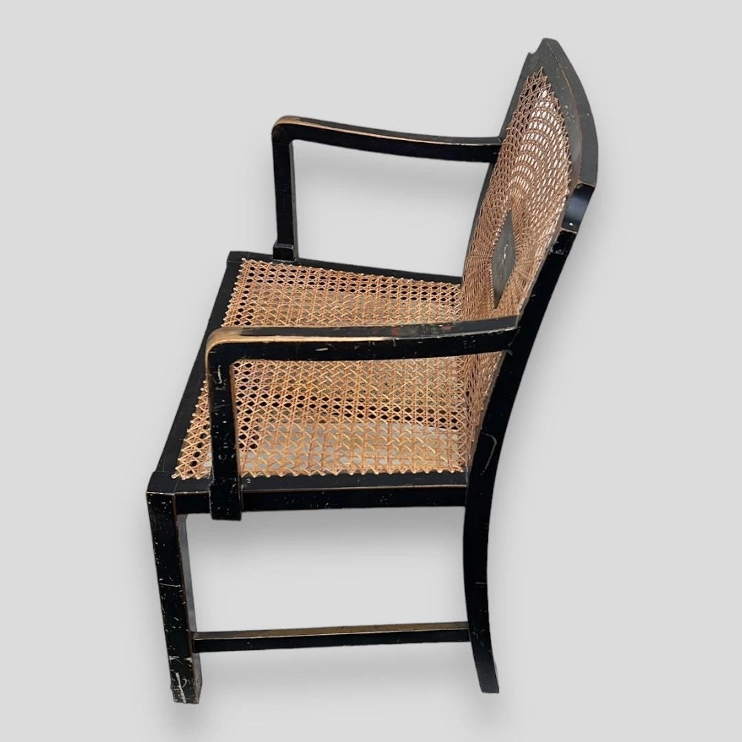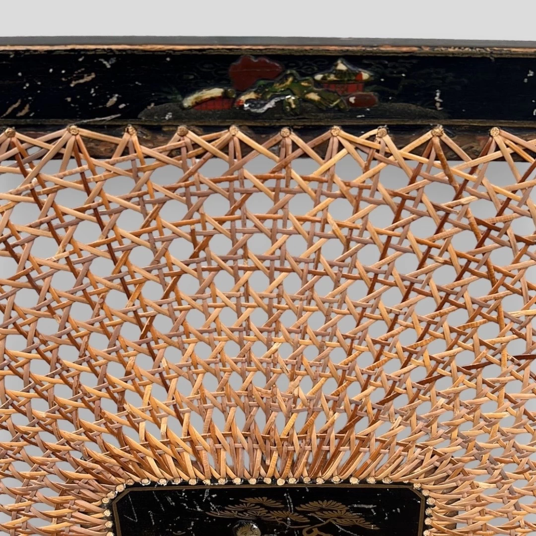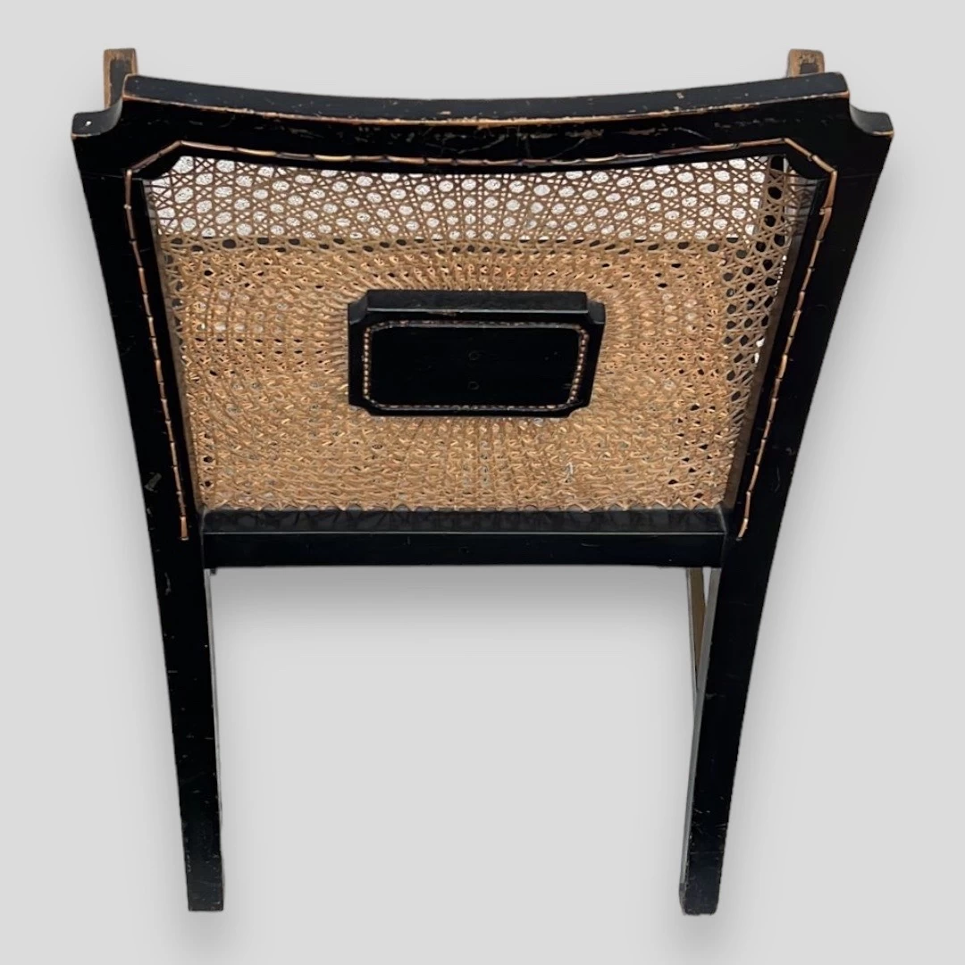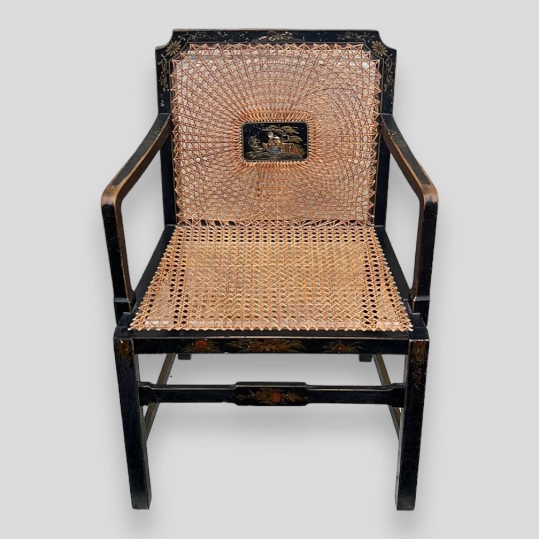 A delightful, mid 19th C , Chinoiserie Decorated , Black Lacquered and Bergere Panelled Bedroom Chair.