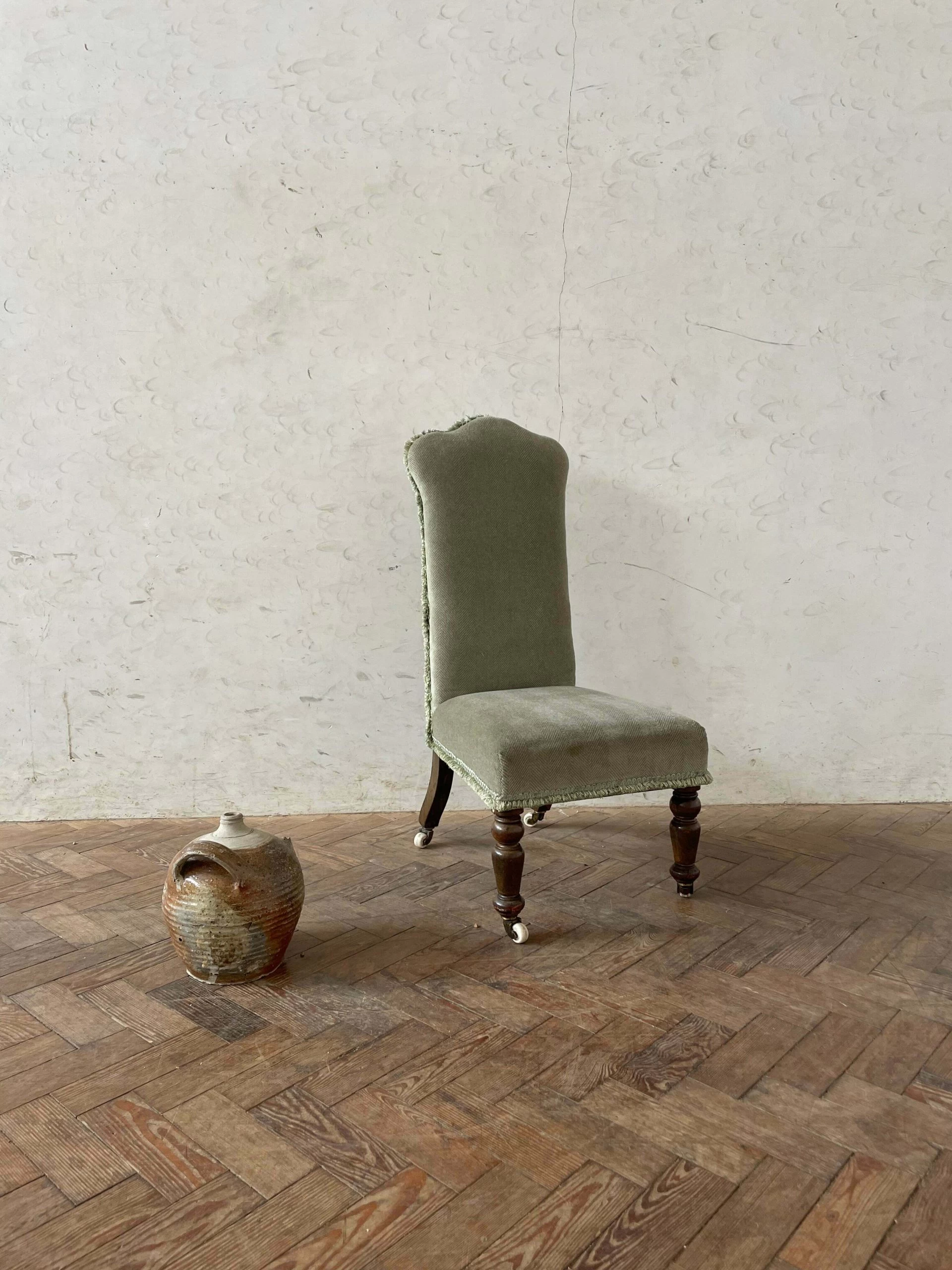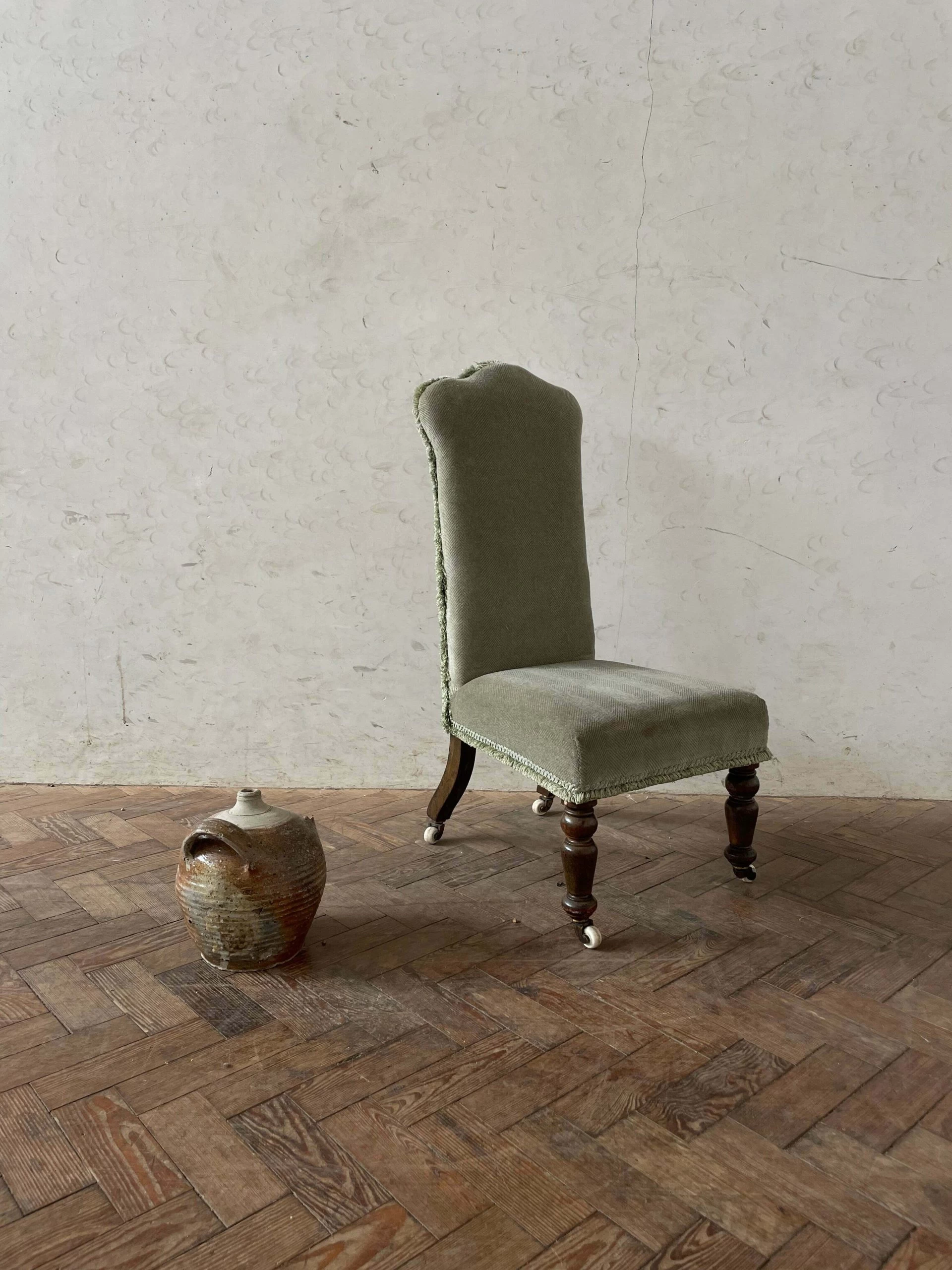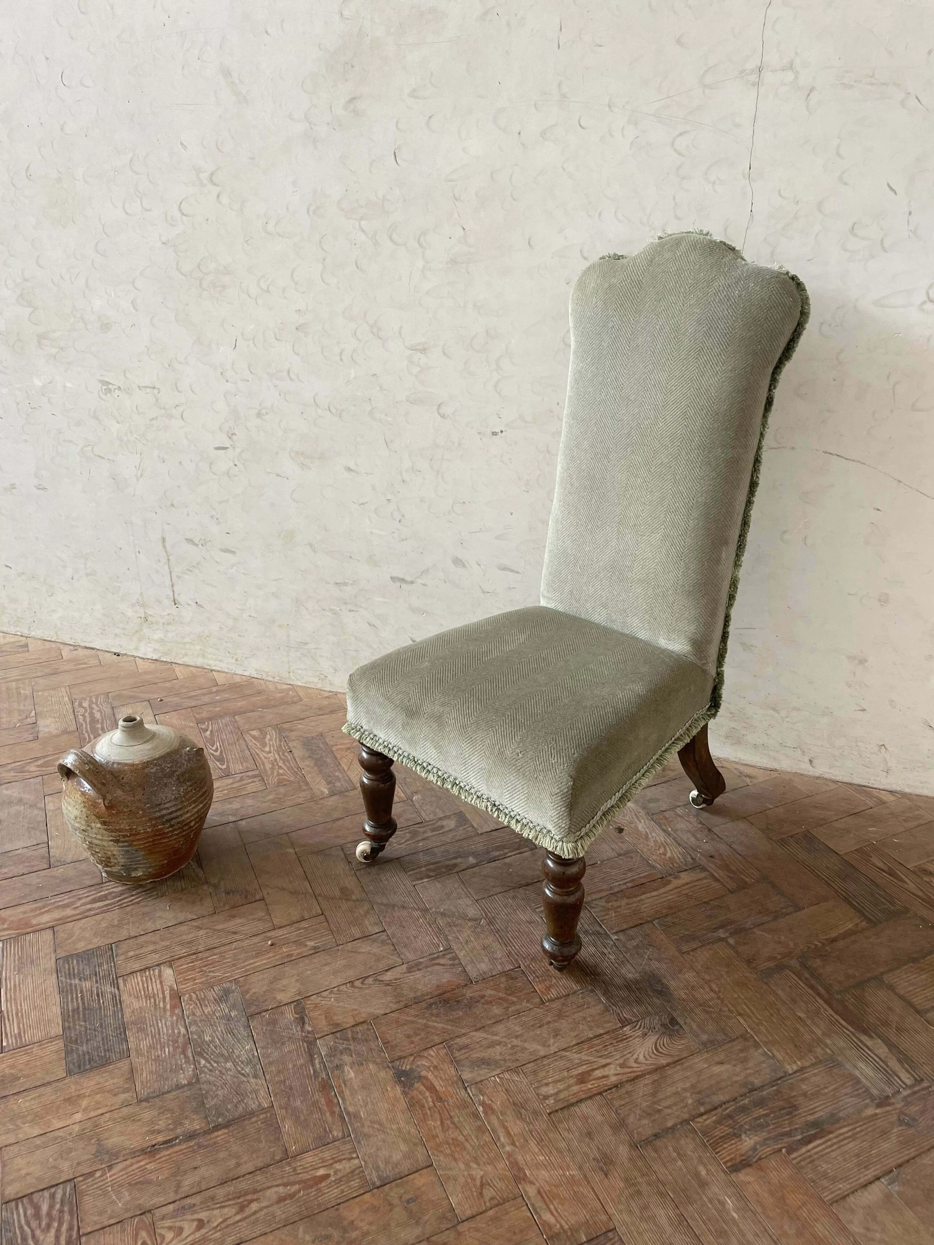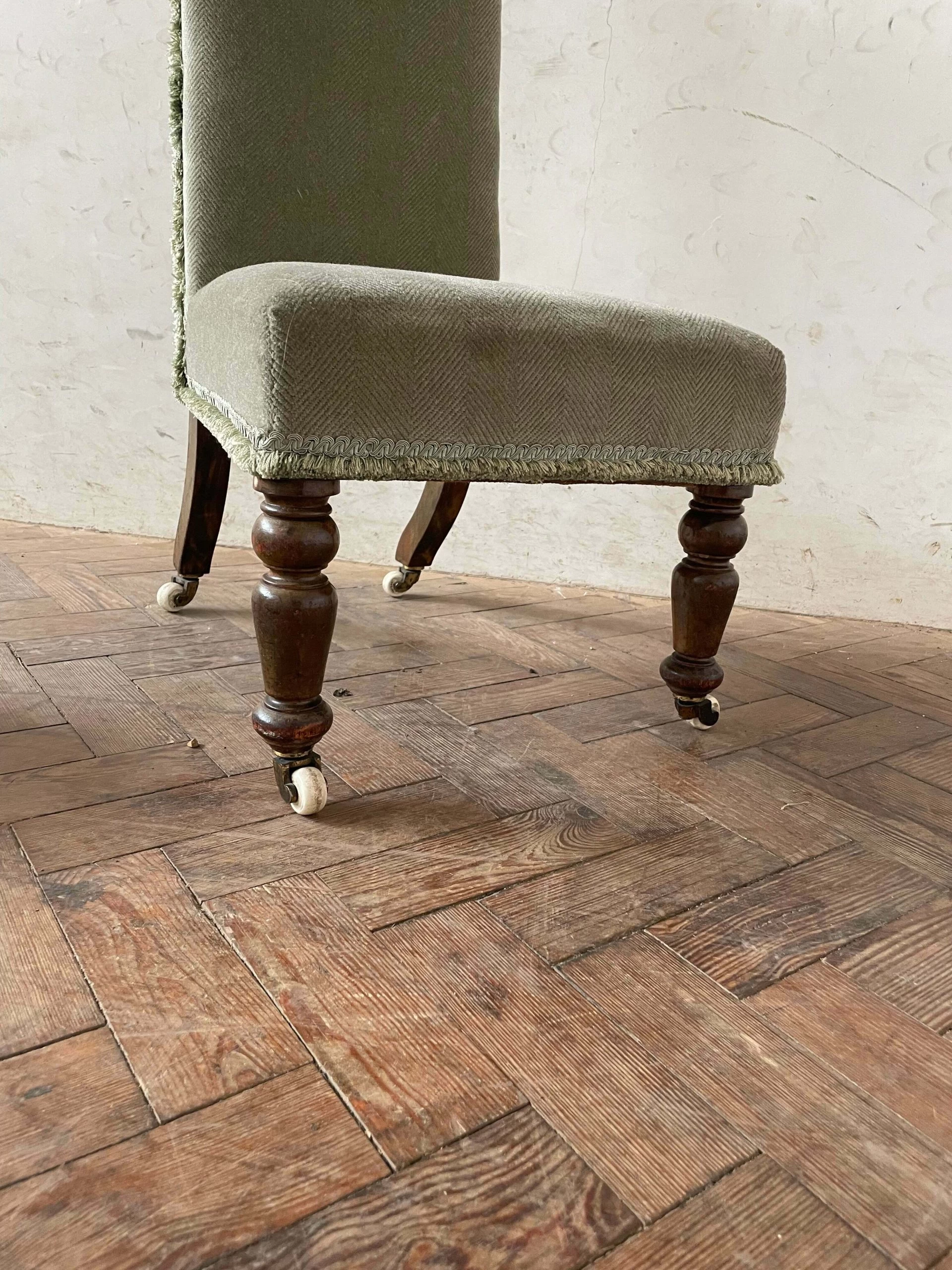 Lovely little Victorian bedroom chair – fabric is a little worn in the bottom right corner but overall it’s good and few faint marks could probably be cleaned out if done professionally but not really noticable, original castors and good legs.